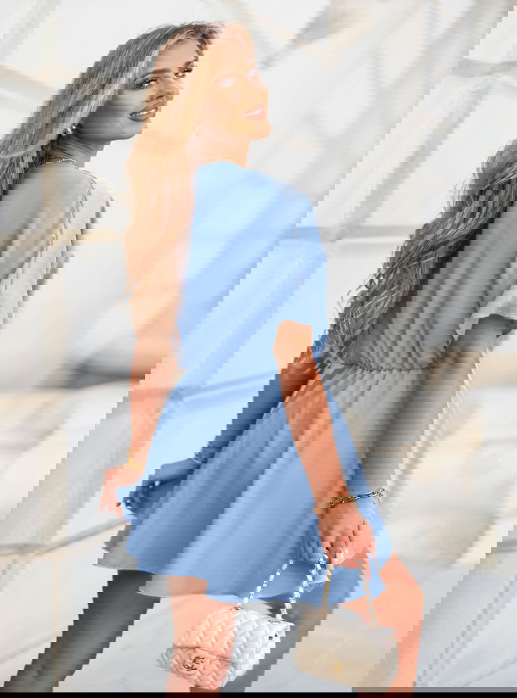Błękitny kombinezon jak sukienka z przekładanym dekoltem Kristeena to synonim letniego świeżego stylu i kobiecej lekkości. Inspirowany śródziemnomorską estetyką, zachwyca spokojnym, niebiańskim kolorem, który przywodzi na myśl błękitne niebo. To propozycja idealna na dni pełne słońca, spontaniczne spotkania i romantyczne wieczory. Niezwykle komfortowy, ale przy tym subtelnie elegancki – łączy wygodę kombinezonu z urokiem letniej sukienki. Przekładany dekolt pięknie eksponuje linię szyi i optycznie wydłuża sylwetkę. Talia z delikatnym marszczeniem podkreśla kobiecą figurę, a zwiewny dół dodaje dziewczęcego uroku. Krótkie rękawy luźno opadają na ramiona, tworząc wrażenie lekkości i swobody. To model, który można założyć zarówno na co dzień, jak i na wyjątkowe okazje. Błękit w tym wydaniu działa odświeżająco i pasuje do każdego typu urody.