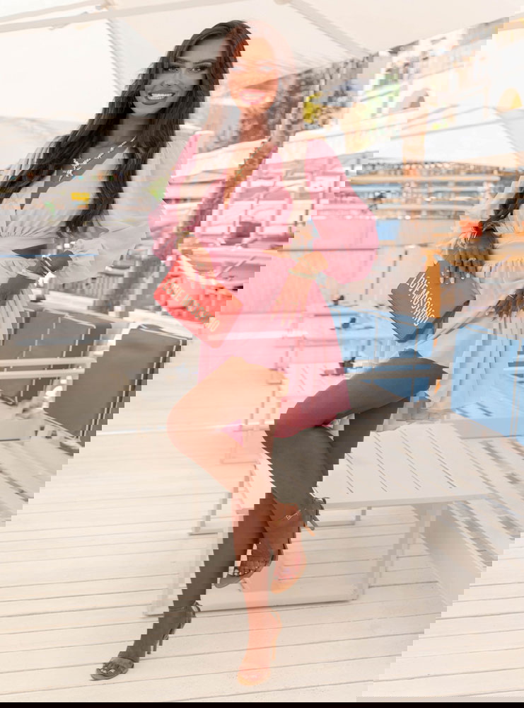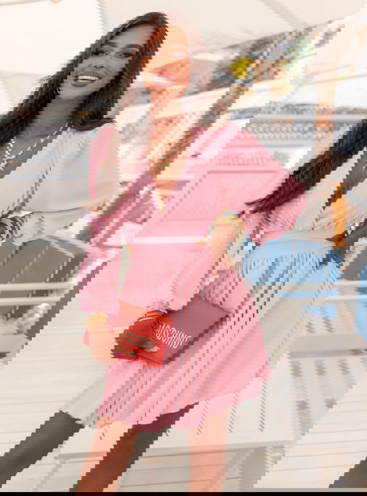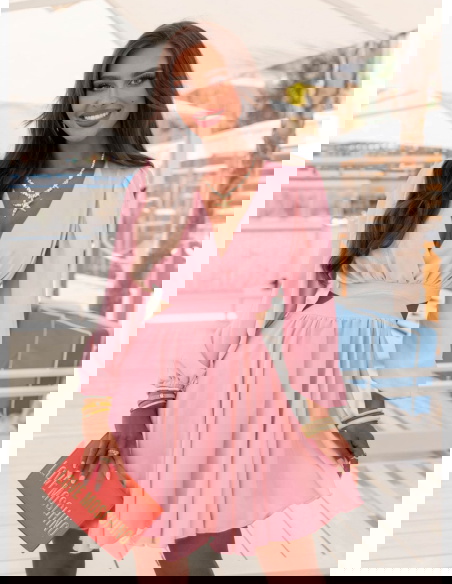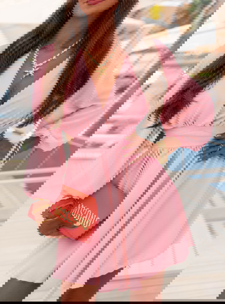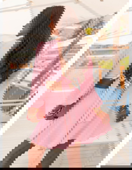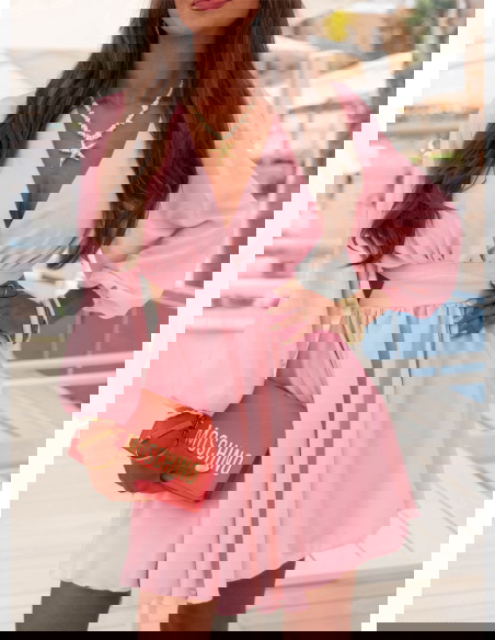 Pudrowa sukienka rozkloszowana z wycięciem Eracla