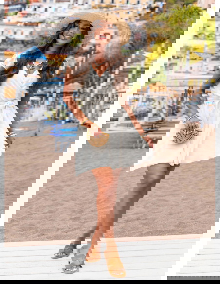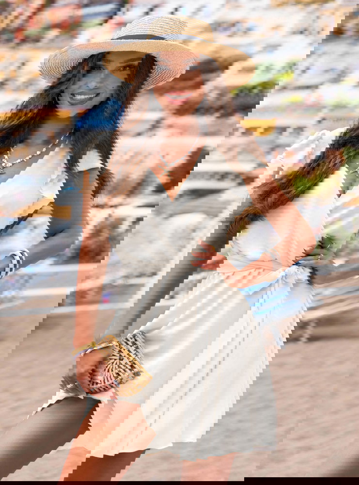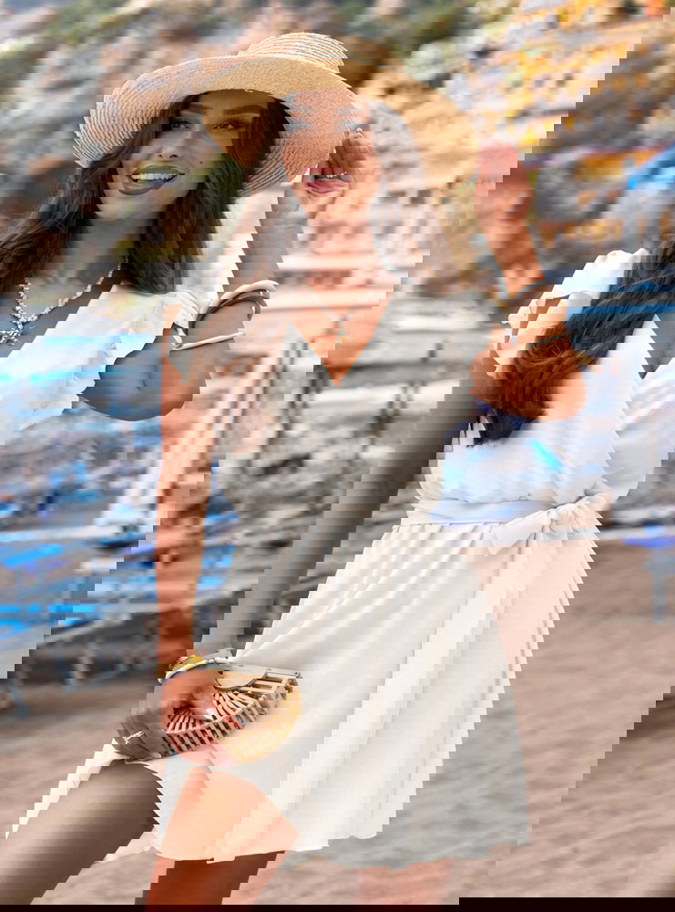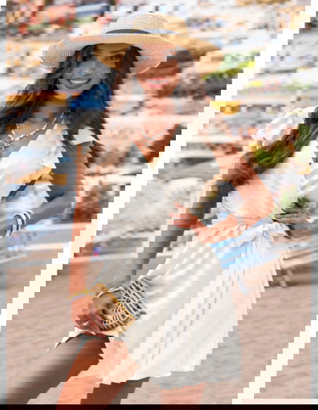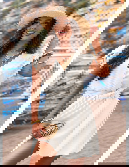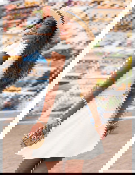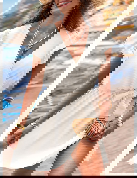 Biała sukienka z przekładanym dekoltem Cleliaa to ponadczasowy model, który doskonale oddaje lekki i kobiecy charakter kolekcji Positano. Idealna na słoneczne dni, kiedy liczy się wygoda i styl – subtelna, a zarazem przyciągająca spojrzenia. Jej kopertowy krój pięknie podkreśla dekolt i optycznie wysmukla sylwetkę, a delikatne wiązanie w talii pozwala dopasować fason do figury. Krótkie falbaniaste rękawki dodają sukience uroku i nadają letniego wdzięku. Biała barwa jest świeża, klasyczna i uniwersalna – pasuje zarówno do plażowego koszyka, jak i eleganckiej torebki. Rozkloszowany dół nadaje lekkości i sprawia, że sukienka pięknie prezentuje się w ruchu. To model, który założysz i od razu poczujesz się wyjątkowo – niezależnie od okazji. Wystarczy kapelusz, kilka wakacyjnych dodatków i gotowe – letnia stylizacja jak z widokówki. Sukienka doskonale odnajduje się w słonecznym klimacie południa, ale równie dobrze wygląda w miejskim otoczeniu. W kolekcji Positano to klasyka w najpiękniejszym, kobiecym wydaniu.