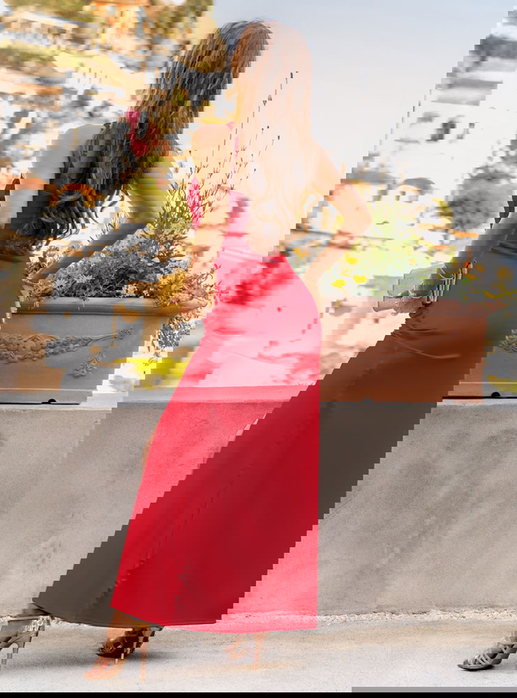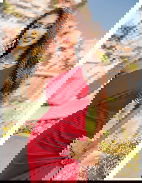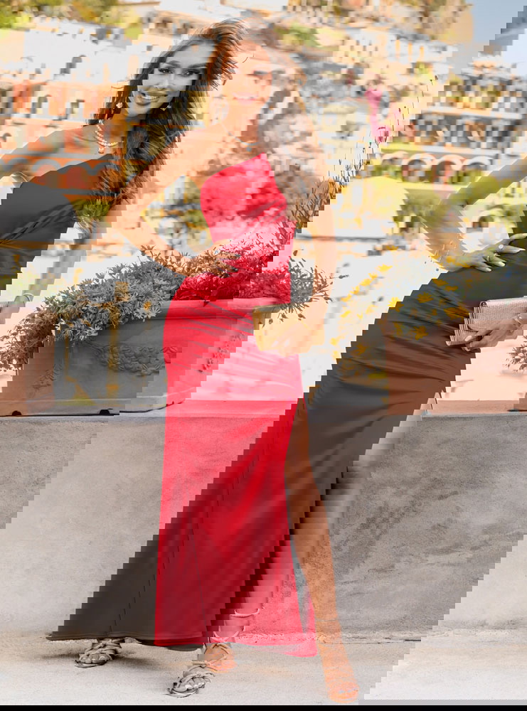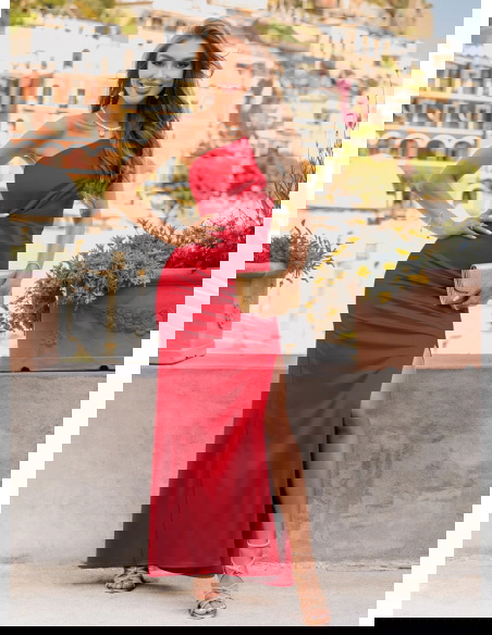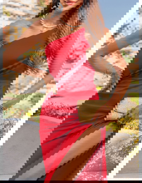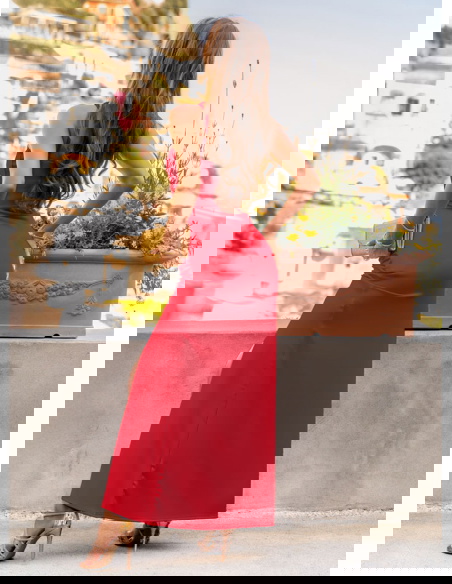 Malinowa długa sukienka z rozcięciem Elga będzie idealnym wyborem na wakacyjne przyjęcie, romantyczną kolację lub uroczysty wieczór z bliskimi. Świetnie sprawdzi się także jako kreacja na wesele, szczególnie te odbywające się latem lub w plenerze.