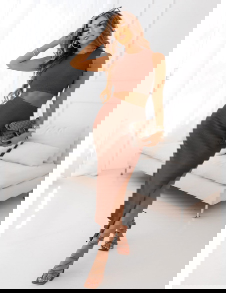 Prążkowany komplet top+spódnica z rozcięciem Perlla - mocha mousse