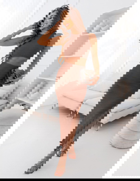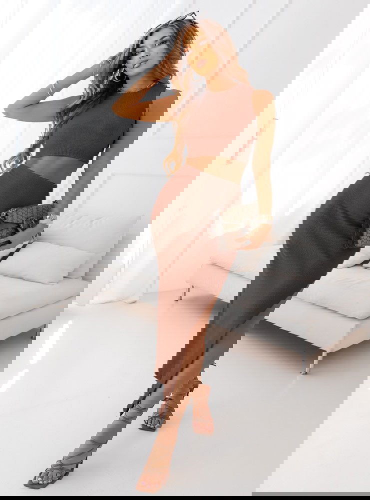 Prążkowany komplet top+spódnica z rozcięciem Perlla - mocha mousse to model, który wygląda efektownie, ale nie wymaga wysiłku – wystarczy założyć i jesteś gotowa. Idealny wybór na lato – kobiecy, wygodny i stylowy. Jeśli szukasz uniwersalnego zestawu, który sprawdzi się w wielu sytuacjach, Perlla będzie strzałem w dziesiątkę.