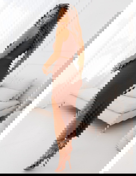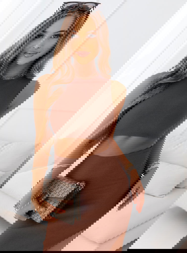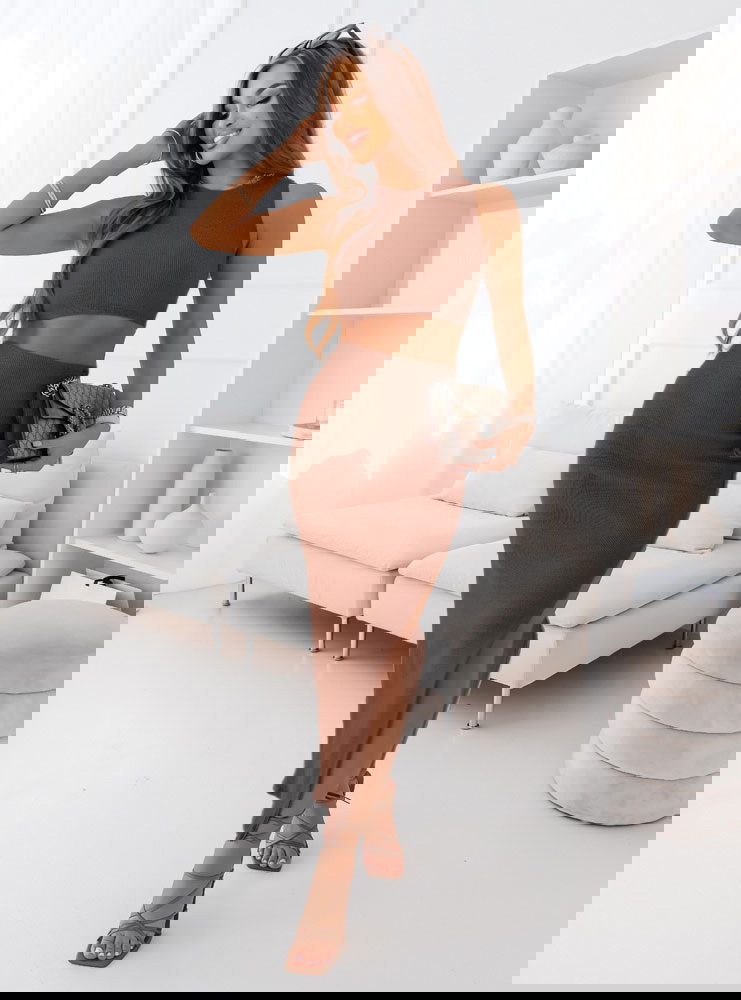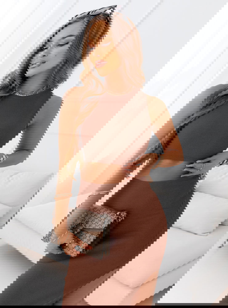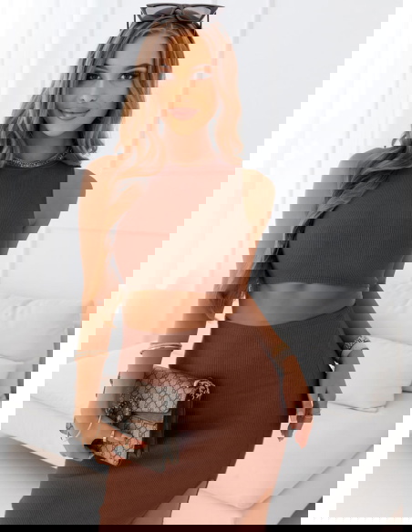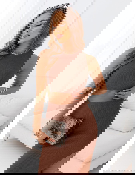 Prążkowany komplet top+spódnica z rozcięciem Perlla - mocha mousse to stylowa propozycja na letnie dni, która łączy minimalizm z wyrazistym charakterem. Głęboki, kawowy odcień mocha mousse świetnie współgra z opalenizną i doskonale wpisuje się w ciepłą kolorystykę sezonu. Top o dopasowanym fasonie z zabudowanym dekoltem i bez rękawów pięknie podkreśla ramiona i talię, dodając sylwetce smukłości. Spódnica midi z wysokim stanem i subtelnym rozcięciem z boku wydłuża nogi i zapewnia wygodę w ruchu. Prążkowana faktura materiału dodaje kompletowi nowoczesnego charakteru, a jednocześnie optycznie modeluje ciało. Całość tworzy modny, lekki i kobiecy look – idealny zarówno na miasto, jak i na wakacyjny wyjazd.