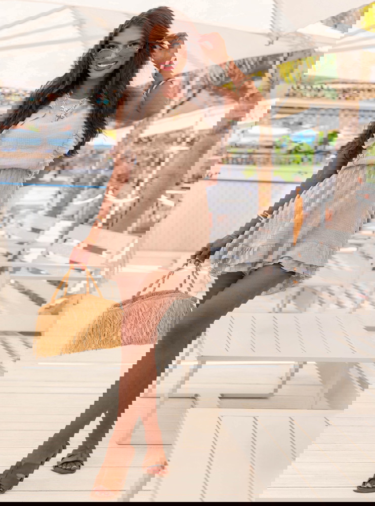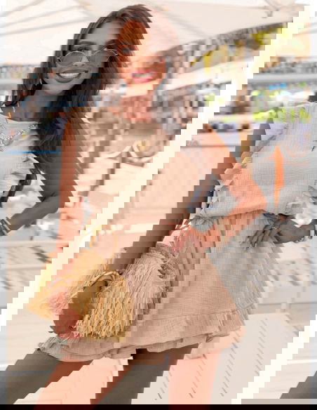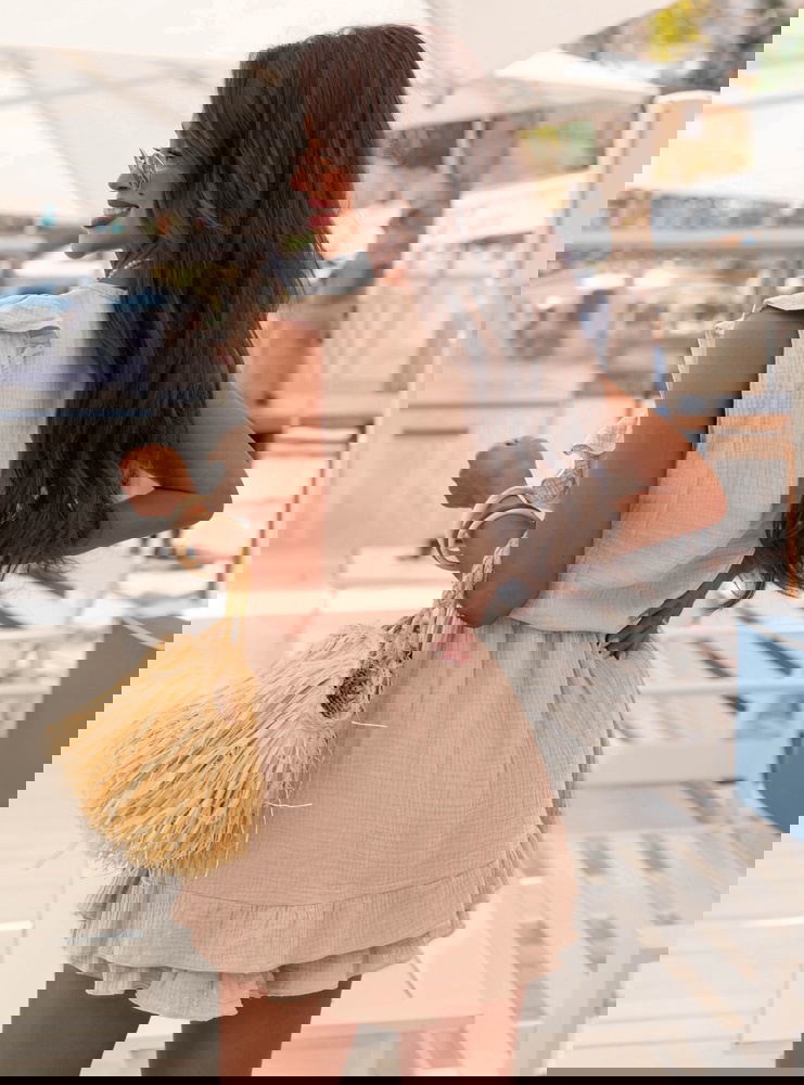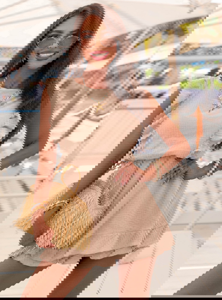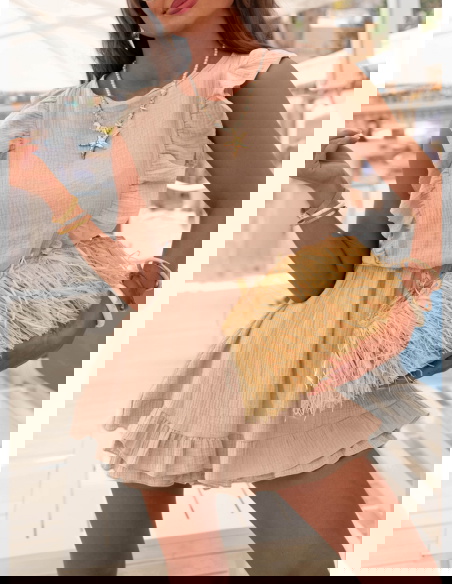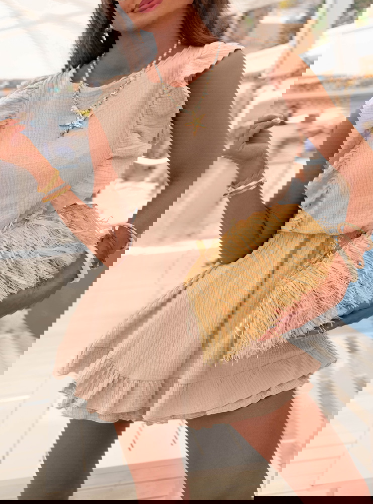 Beżowy muślinowy kombinezon jak sukienka Gratin to kwintesencja letniego stylu z nutą włoskiego luzu. Inspirowany klimatem śródziemnomorskich kurortów, doskonale oddaje ducha wakacyjnych dni. Z pozoru wygląda jak zwiewna sukienka, a w rzeczywistości to komfortowy kombinezon, który daje pełną swobodę ruchów. To idealne połączenie lekkości i wygody w kobiecym wydaniu. Stylowe falbanki przy ramionach i na dole dodają całości dziewczęcego uroku. Luźny fason pięknie układa się na sylwetce, nie opinając ciała i zapewniając komfort przez cały dzień. Subtelny odcień beżu podkreśla opaleniznę i świetnie komponuje się z wakacyjnymi dodatkami. Ten model przyciąga uwagę swoją prostotą, a jednocześnie wyróżnia się na tle klasycznych letnich stylizacji.