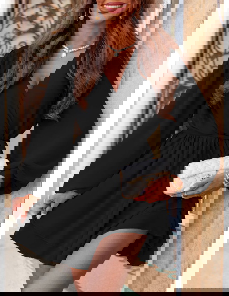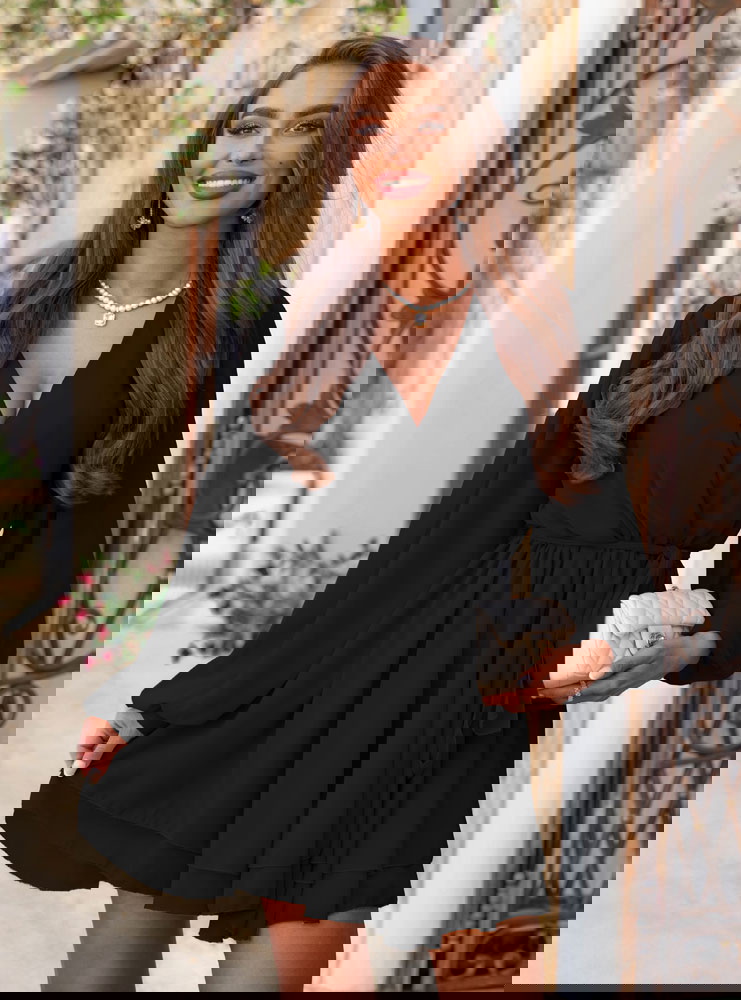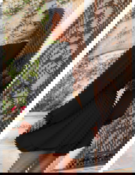 Czarna szyfonowa sukienka mini z przekładanym dekoltem Aspasia to klasyka w najlepszym wydaniu – elegancka, wygodna i kobieca. Jej lekki krój i uniwersalny kolor sprawiają, że łatwo wpasowuje się w każdą garderobę. Możesz założyć ją bez względu na okazję – zawsze będzie prezentować się stylowo. To idealne połączenie wygody i klasy, bez przesadnej formalności.