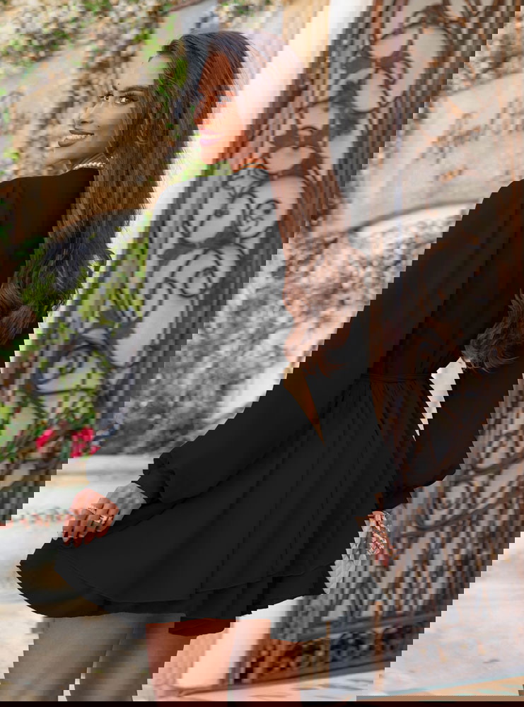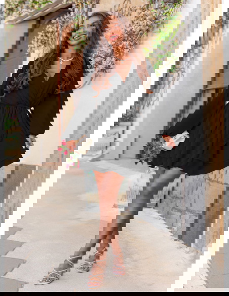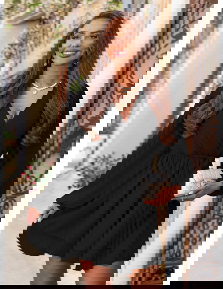 Czarna szyfonowa sukienka mini z przekładanym dekoltem Aspasia to doskonały wybór dla kobiet, które cenią ponadczasową elegancję w lekkim, letnim wydaniu. To sukienka, która łączy klasykę koloru z nowoczesnym, zwiewnym krojem. Przekładany dekolt pięknie podkreśla szyję i obojczyki, dodając całości subtelnego uroku. Długie, luźne rękawy z delikatnym wykończeniem nadają sukience lekkości i stylowej nonszalancji. Talia z wiązaniem pozwala idealnie dopasować fason do sylwetki, podkreślając jej naturalne kształty. Zwiewny, warstwowy dół sukienki porusza się z każdym krokiem, tworząc zmysłowy, ale bardzo kobiecy efekt. Czarna kolorystyka sprawia, że ten model z łatwością przechodzi od codziennego luzu do wieczorowej elegancji. To propozycja, która nigdy nie wychodzi z mody i zawsze wygląda odpowiednio. W kolekcji Positano pełni rolę stylowej klasyki – uniwersalnej, ale z charakterem. Idealna dla kobiet, które lubią czuć się swobodnie i wyglądać z klasą, niezależnie od okazji.