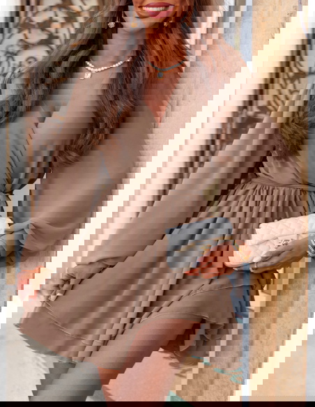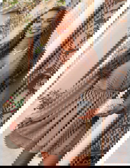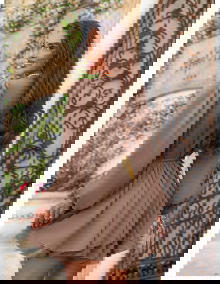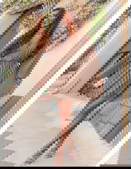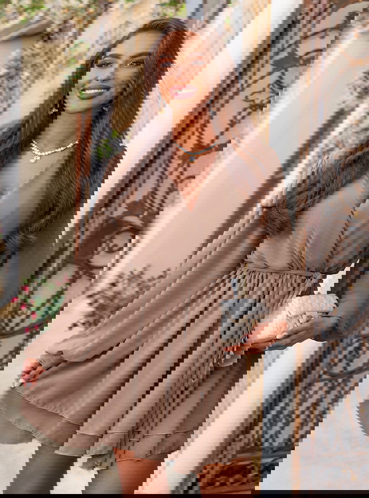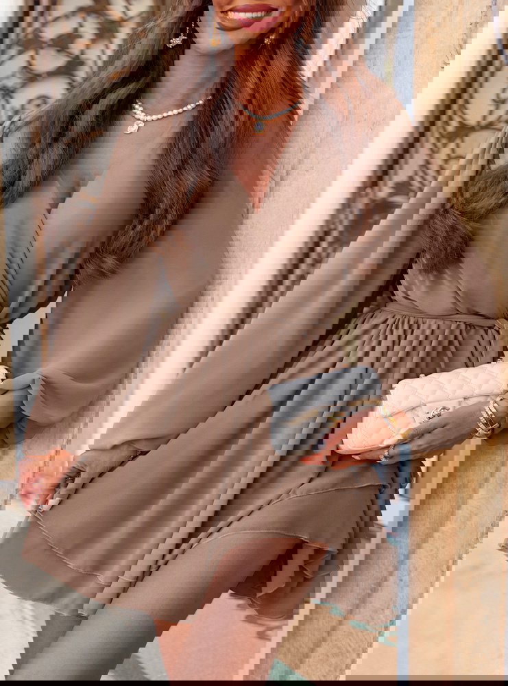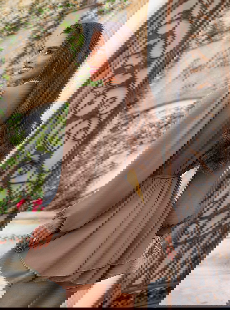 Szyfonowa sukienka mini z przekładanym dekoltem Aspasia - mocha mousse to idealne połączenie elegancji, subtelności i codziennego komfortu. Jej naturalny, kawowy odcień doskonale wpisuje się w neutralne trendy, które królują w letnich stylizacjach. Przekładany dekolt pięknie układa się na sylwetce, subtelnie eksponując szyję i ramiona. Talia z regulowanym wiązaniem pozwala na idealne dopasowanie, podkreślając kobiece proporcje. Dół z lekkimi warstwami dodaje sukience ruchu i zwiewności – efekt, który zachwyca przy każdym kroku. Długie rękawy wprowadzą nutę elegancji, sprawiając, że model ten sprawdzi się także w bardziej wieczorowych odsłonach. Kolor mocha mousse to świetna alternatywa dla klasycznej czerni czy beżu – delikatny, ale wyrazisty i uniwersalny. Sukienka sprawia wrażenie lekkiej i niewymuszonej, a jednocześnie prezentuje się bardzo kobieco. W kolekcji Positano to propozycja dla tych, które cenią spokojną kolorystykę i dopracowany, wygodny krój. To model, który bez trudu dopasujesz do każdej letniej okazji.
