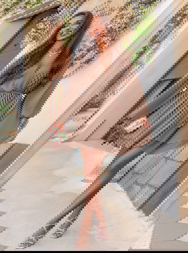 Szyfonowa sukienka mini z przekładanym dekoltem Aspasia - mocha mousse to kwintesencja letniego szyku. Jest kobieca, ale nienachalna; stylowa, ale nieprzerysowana. Jej uniwersalny odcień pasuje do wielu typów urody i sprawdzi się przez wiele sezonów. To idealna baza do stworzenia spokojnych, zrównoważonych stylizacji z nutą elegancji. W kolekcji Positano wyróżnia się swoją stonowaną klasą i wszechstronnością.