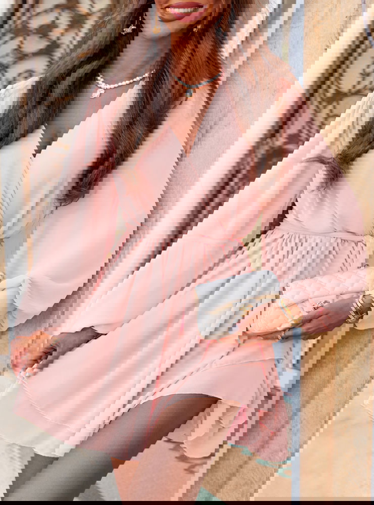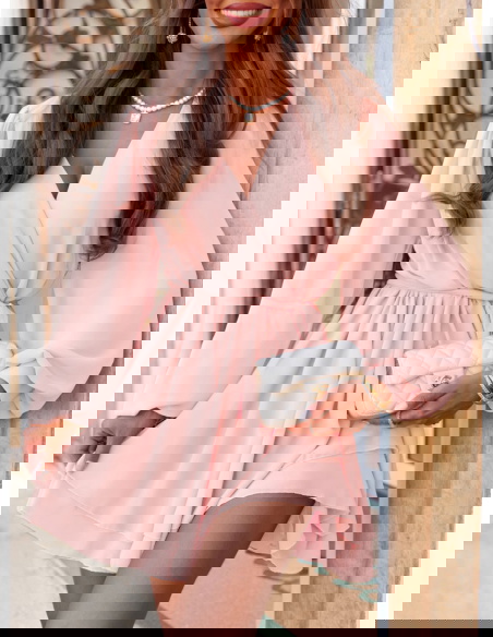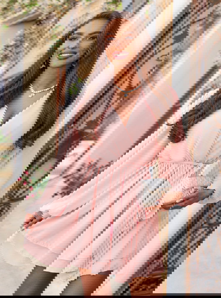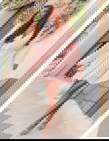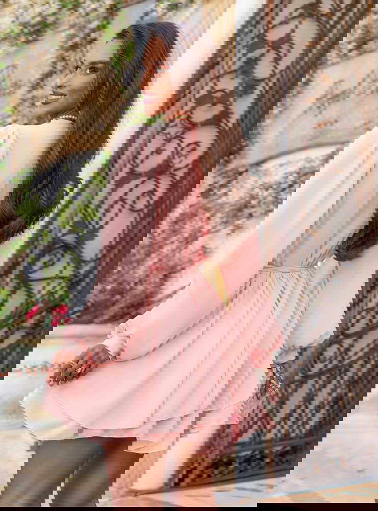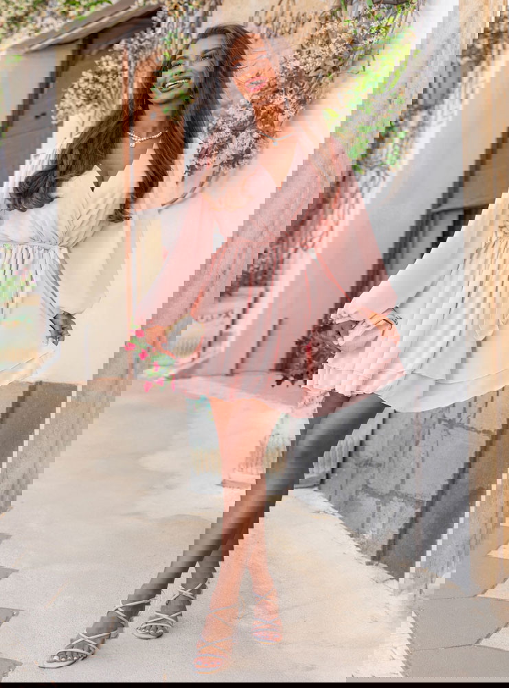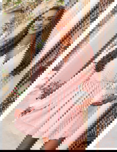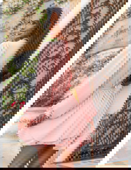 Pudrowa szyfonowa sukienka mini z przekładanym dekoltem Aspasia to kwintesencja kobiecego uroku w lekkiej, romantycznej formie. Jej pastelowy kolor subtelnie podkreśla urodę i dodaje świeżości całej stylizacji. Przekładany dekolt pięknie eksponuje szyję i dekolt, jednocześnie zachowując elegancki, nienachalny charakter. Długie, zwiewne rękawy zakończone lekkim marszczeniem dodają sylwetce lekkości i delikatności. Talia wiązana paskiem pozwala na idealne dopasowanie do figury i podkreślenie kształtów. Warstwowy dół sukienki w ruchu tworzy efekt miękkiej fali, dzięki czemu każda stylizacja nabiera lekkości. Pudrowy róż to kolor, który sprawdza się zarówno na co dzień, jak i na wyjątkowe okazje. W połączeniu z jasnymi dodatkami tworzy dziewczęcy, świeży look – idealny na lato. W kolekcji Positano ten model wyróżnia się romantyzmem i uniwersalnością.