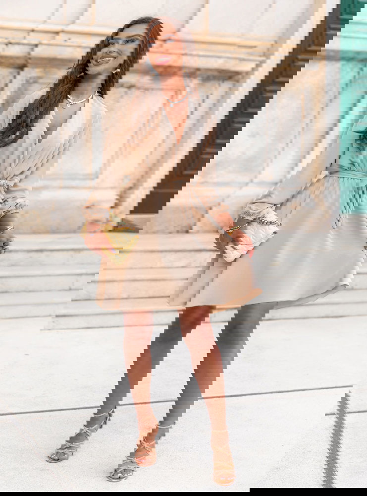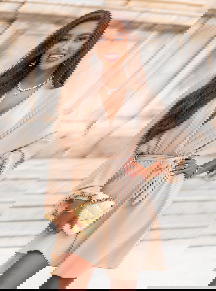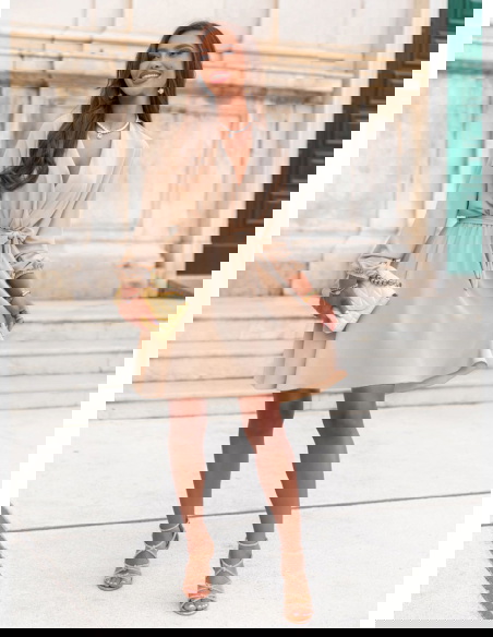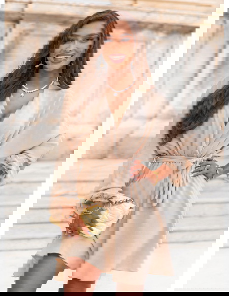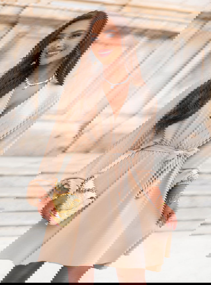 Beżowa sukienka mini z przekładanym dekoltem Anelitta to model, który łączy w sobie wszystko, co potrzebne latem – wygodę, subtelność i elegancki luz. Jej prosty, ale bardzo kobiecy krój sprawia, że z łatwością dopasujesz ją do wielu okazji. Przekładany dekolt pięknie eksponuje szyję i dekolt, tworząc delikatną linię litery „V”. Długie rękawy z lekkim marszczeniem nadają jej wyrafinowanego charakteru, jednocześnie pozostając bardzo komfortowe. Wiązanie w talii pozwala na dopasowanie sukienki do sylwetki i zaznaczenie proporcji. Beżowy kolor jest uniwersalny i ponadczasowy – świetnie wygląda zarówno z jasnymi, jak i kontrastowymi dodatkami. To sukienka, która sprawdzi się zarówno w codziennych stylizacjach, jak i na bardziej wyjątkowe wyjścia. Jej długość mini, połączona z lekkim, zwiewnym fasonem, sprawia, że stylizacja zyskuje lekkość i dziewczęcy urok. Model idealnie wpisuje się w klimat kolekcji Positano – naturalny, kobiecy i pełen wakacyjnej swobody. To sukienka, po którą sięgasz bez zastanowienia – bo po prostu zawsze pasuje.