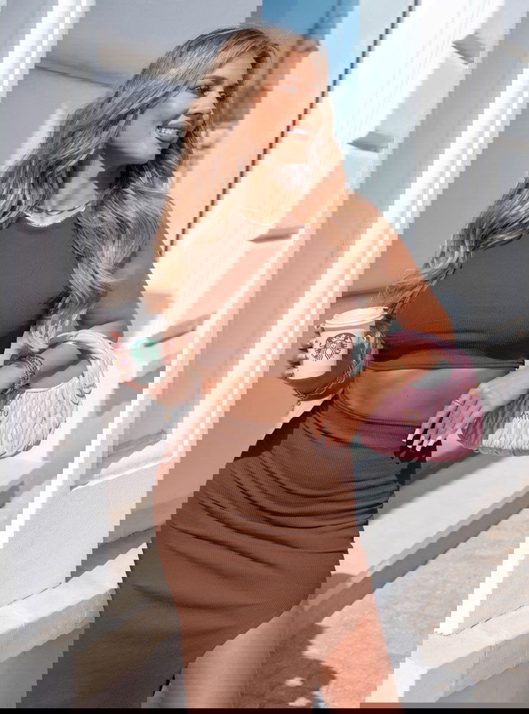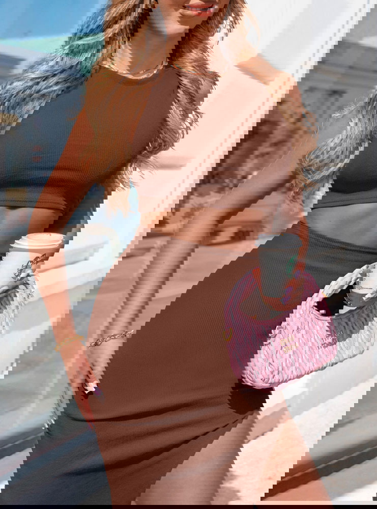 Prążkowany komplet top+spódnica z rozcięciem Jalise - mocha mousse to must-have tego sezonu! Stylowy, kobiecy i niezwykle wygodny komplet, który idealnie sprawdzi się w letnich stylizacjach. Krótki, dopasowany top z zabudowanym dekoltem subtelnie podkreśla ramiona i talię. Spódnica midi z wysokim stanem i efektownym rozcięciem z boku dodaje sylwetce lekkości i zmysłowości, nie rezygnując z wygody. Całość wykonana z miękkiego, prążkowanego materiału, który świetnie dopasowuje się do ciała, zapewniając komfort i swobodę ruchów. Czekoladowy odcień mocha mousse to propozycja uniwersalna – pasuje do różnych karnacji i idealnie wpisuje się w letni klimat.