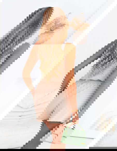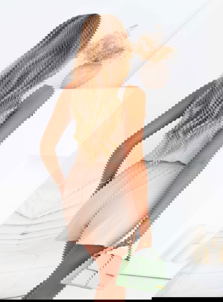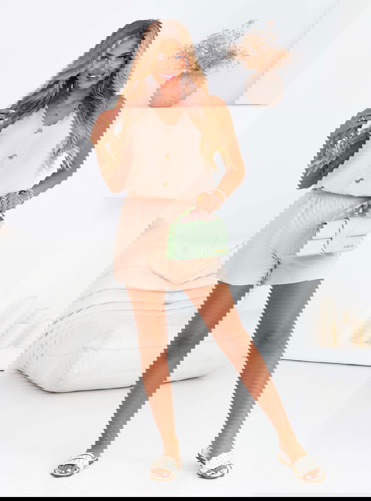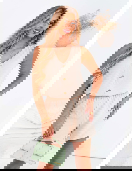 Beżowy komplet bluzka i szorty Ermellina to kwintesencja letniego luzu w stylowym wydaniu. Jego jasny, neutralny kolor świetnie wpisuje się w wakacyjny klimat i pasuje do każdej karnacji. To zestaw, który zachwyca prostotą i funkcjonalnością, ale nie brakuje mu uroku. Minimalistyczna bluzka z guzikami i szerokimi ramiączkami subtelnie eksponuje ramiona, a jednocześnie zapewnia wygodę noszenia. Szorty z elastyczną talią gwarantują swobodę i dopasowanie bez uczucia skrępowania. Razem tworzą komplet, który można nosić na wiele sposobów i zawsze wyglądać dobrze. Beżowy odcień jest bardzo uniwersalny – łatwo zestawisz go z dodatkami w różnych kolorach, tworząc różne nastroje stylizacji.
