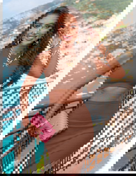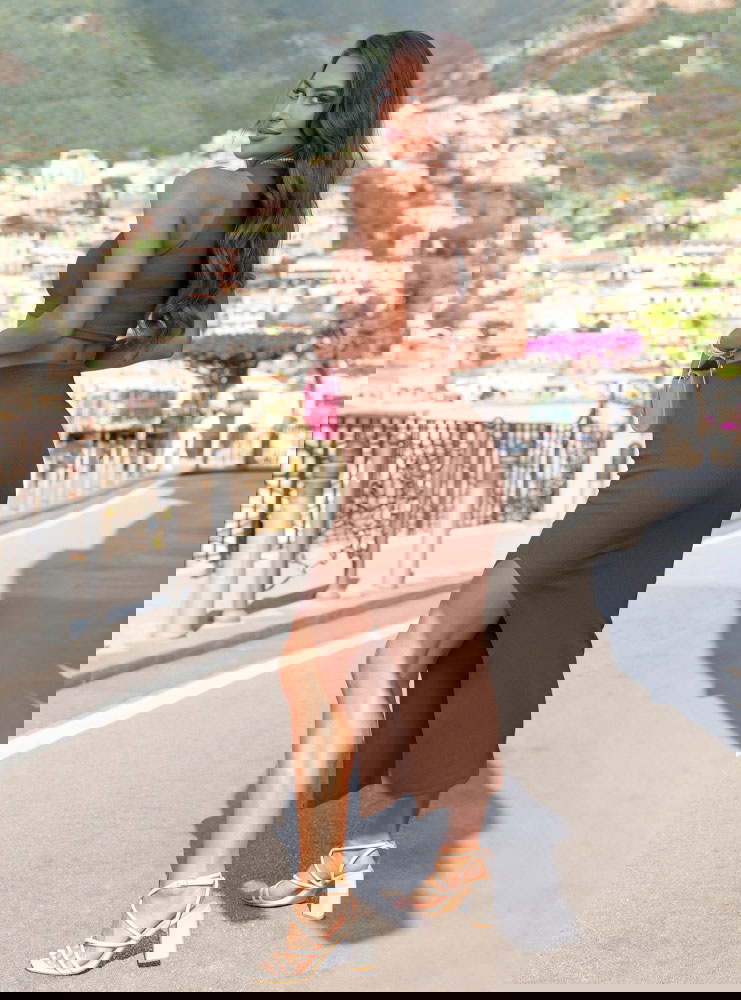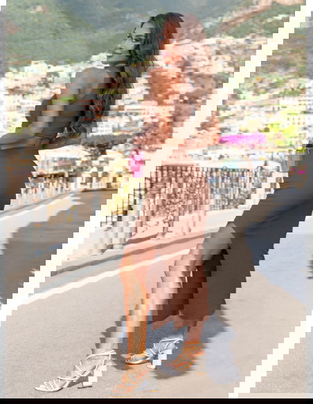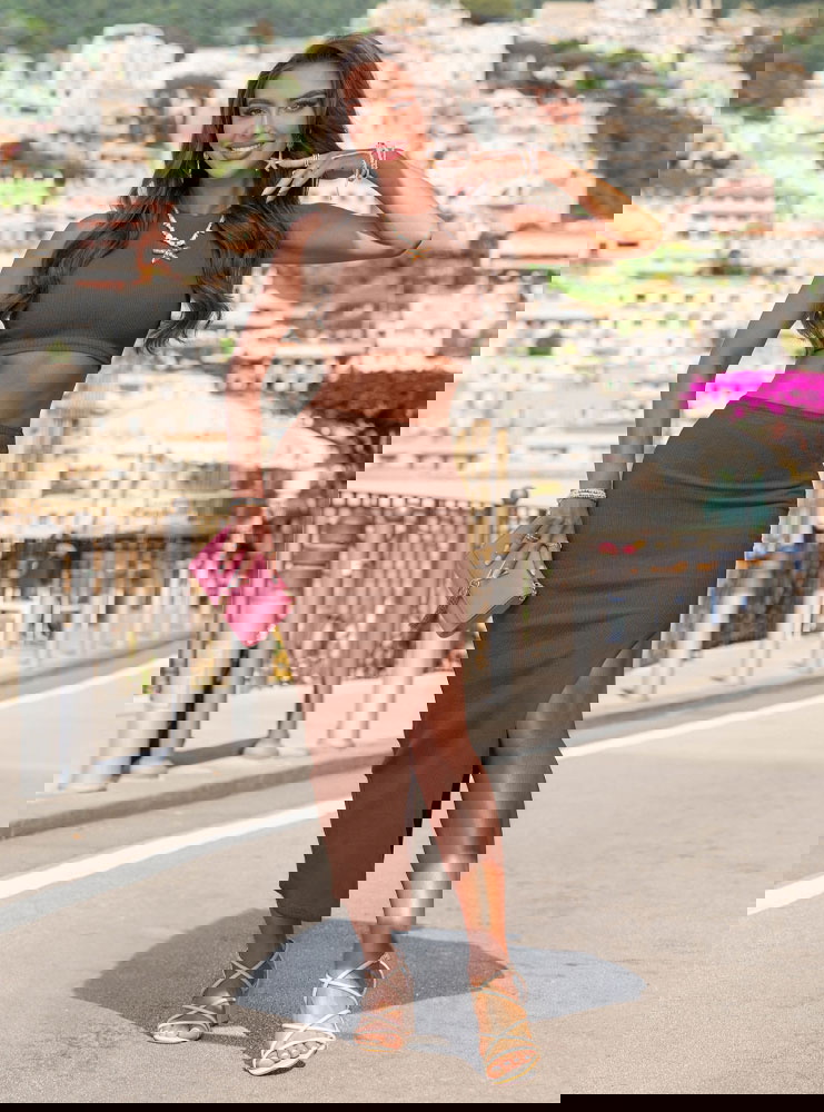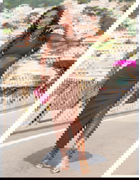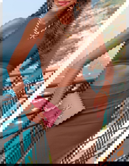 Prążkowany komplet top+spódnica z rozcięciem Shantell - mocha mousse to niezawodna baza letnich stylizacji. Jest wygodny, kobiecy i wpisuje się w aktualne trendy. Ciepły, neutralny kolor podkreśla wakacyjny klimat, a jednocześnie jest bardzo uniwersalny. To zestaw, który wygląda efektownie, ale jest niezwykle łatwy w noszeniu. Z kolekcji Positano – inspirowanej lekkością i włoskim stylem życia – ten komplet wyróżnia się wyważonym charakterem.