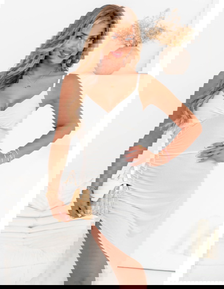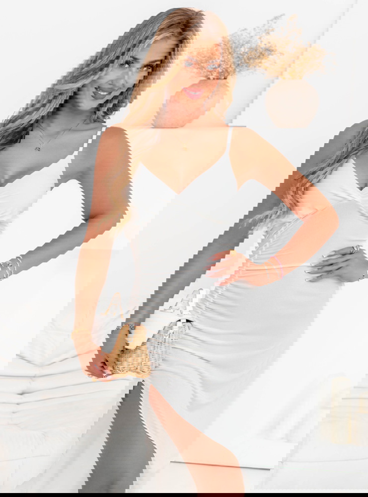 Biała sukienka na ramiączkach z rozcięciem Chasya to dopasowana sukienka z cienkimi ramiączkami i efektownym rozcięciem z przodu. Dekolt w delikatny sposób podkreśla górną część sylwetki, a krój pięknie eksponuje talię i biodra. Biała kolorystyka dodaje lekkości i pozwala na wiele możliwości stylizacyjnych. Sukienka jest bardzo uniwersalna – można ją nosić na wiele różnych sposobów. To jeden z tych modeli, który warto mieć w swojej letniej garderobie.