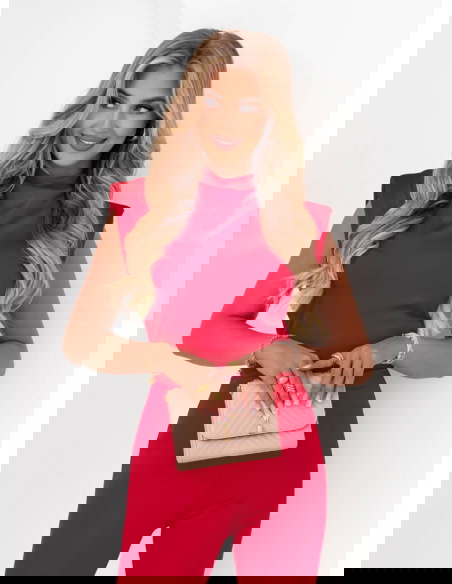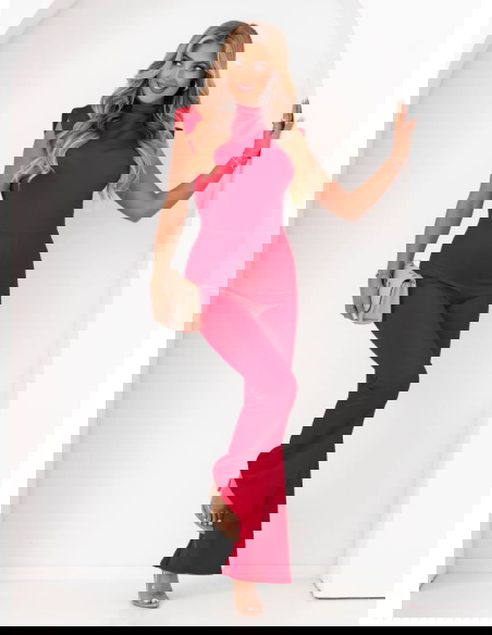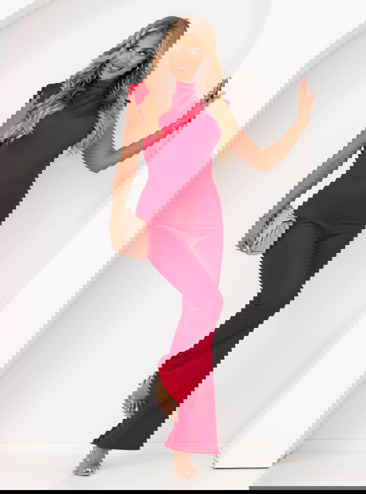 Malinowy dopasowany kombinezon bez rękawów Sayako to doskonała propozycja dla kobiet ceniących styl i kobiecość. Intensywny, nasycony odcień malinowy przyciąga wzrok i dodaje energii każdej stylizacji. Dopasowany krój świetnie eksponuje figurę, a rozszerzane nogawki optycznie wydłużają sylwetkę. Górna część ozdobiona jest efektowną stójką i subtelnym marszczeniem przy dekolcie, które dodają klasy. Materiał jest elastyczny i przyjemny w dotyku – zapewnia wygodę zarówno w codziennym noszeniu, jak i podczas wyjątkowych okazji. Model pięknie podkreśla talię i tworzy kobiecą sylwetkę w stylu klepsydry. Malinowa kolorystyka idealnie pasuje zarówno do złotych, jak i neutralnych dodatków. To kombinezon, który mówi „jestem pewna siebie” – świetnie sprawdzi się, gdy chcesz zrobić wrażenie. Stylowy, zmysłowy i praktyczny – must-have tego sezonu.