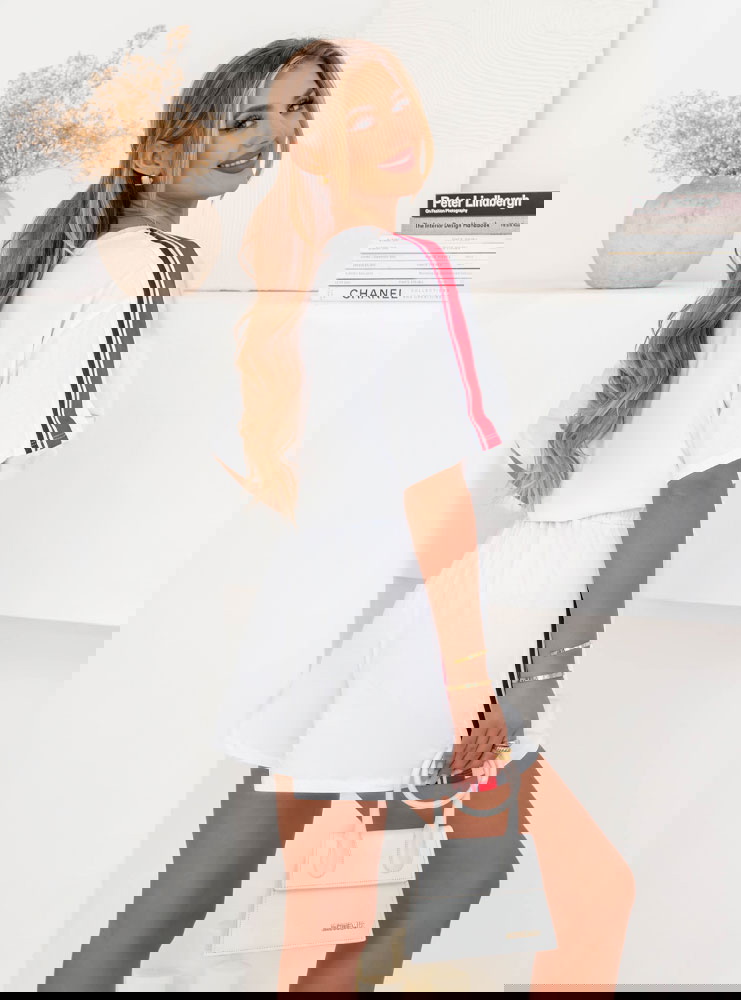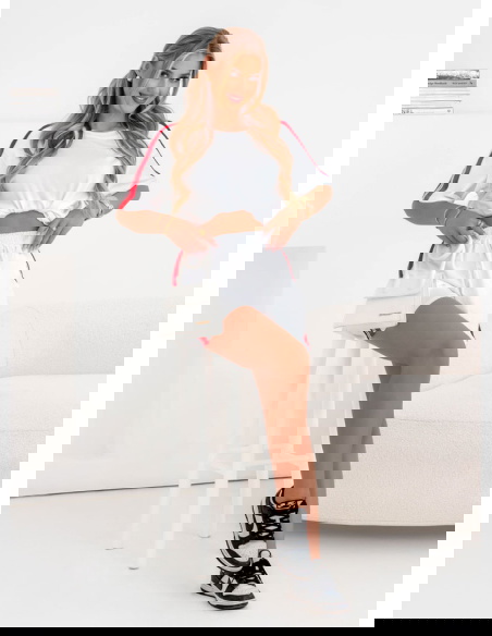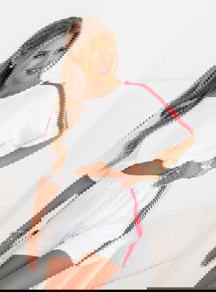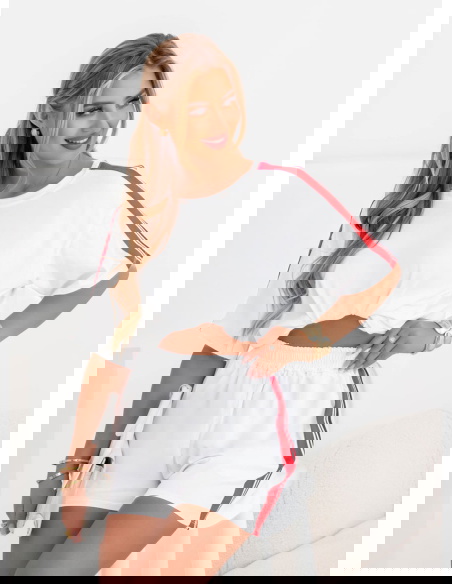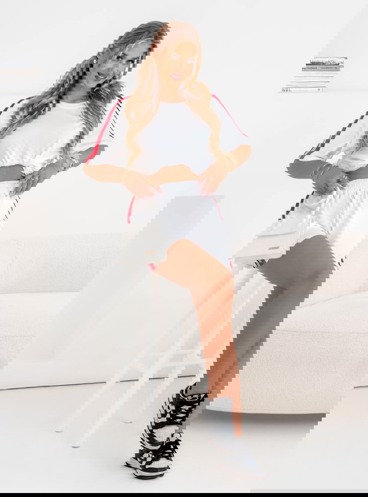Biały komplet koszulka i szorty Sumet to propozycja, która zachwyca lekkością, świeżością i nowoczesnym sportowym charakterem. Idealny na dni, kiedy chcesz czuć się swobodnie, a jednocześnie prezentować się stylowo. Biel zawsze wygląda schludnie i dziewczęco, a dodatkowe kolorowe lampasy dodają zestawowi modnego akcentu. Koszulka o luźnym kroju świetnie współgra z szortami, tworząc harmonijną, wygodną całość. Góra z krótkim rękawem i lekko oversize’owym fasonem nadaje się do różnych sylwetek i pozwala czuć się swobodnie przez cały dzień. Szorty z elastycznym pasem dopasowują się do talii, nie uciskając i zapewniając wygodę w każdej sytuacji. Ten zestaw nie wymaga dodatków – już sam w sobie robi efekt „wow”. To must-have dla kobiet, które cenią praktyczność w nowoczesnym wydaniu. Niezależnie, czy założysz go na spacer, czy szybkie wyjście do miasta – sprawdzi się doskonale. Ten komplet to prostota, która zawsze się obroni.