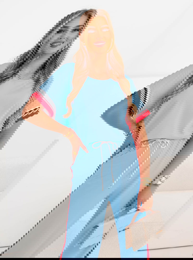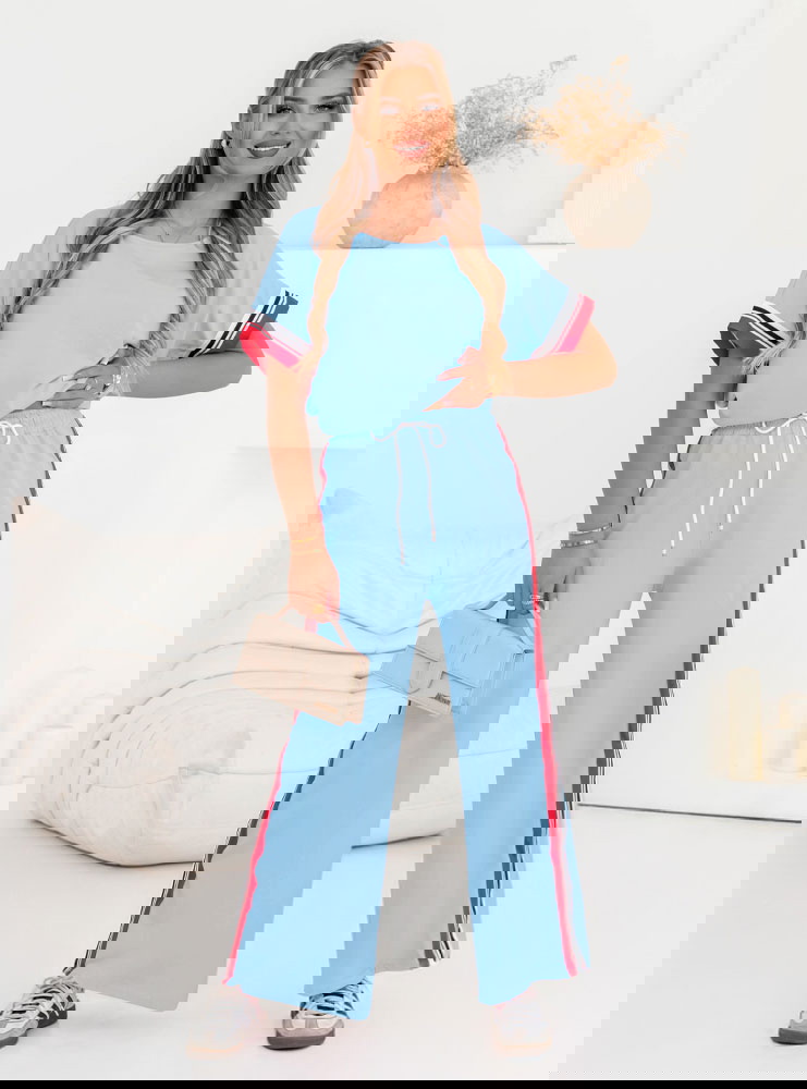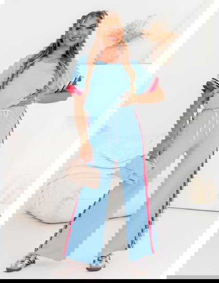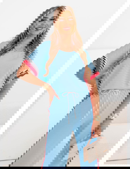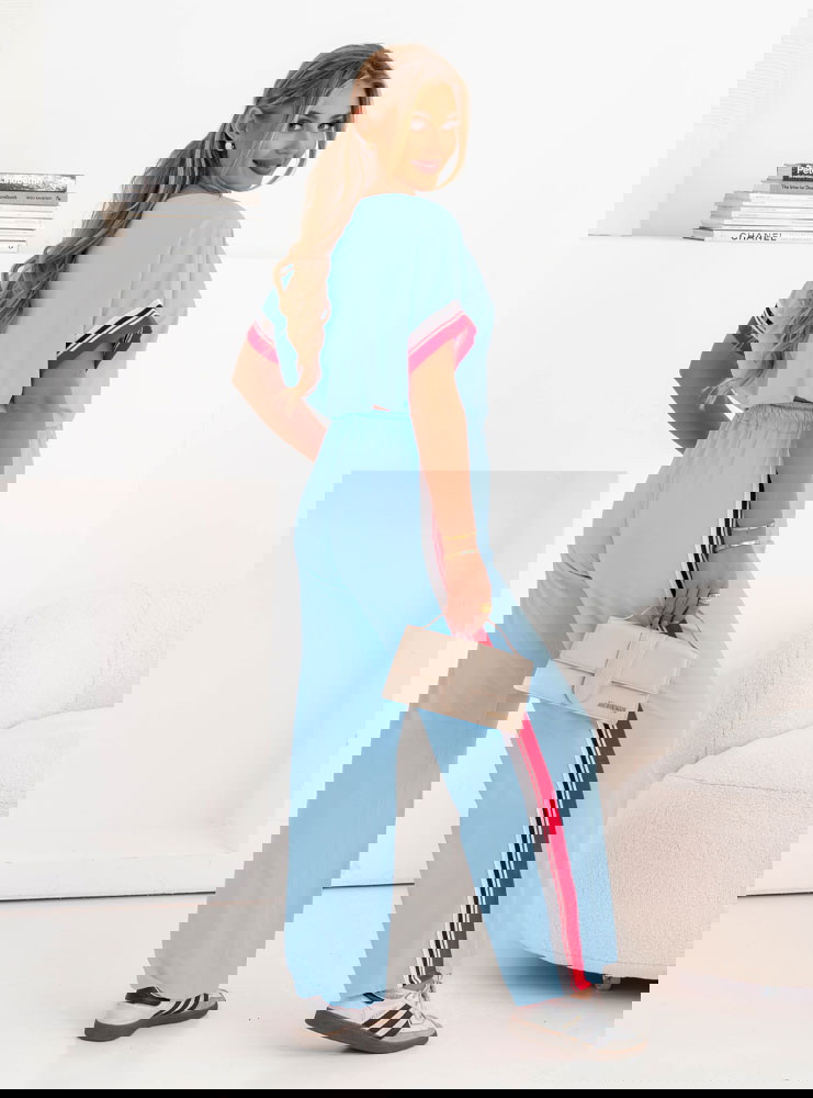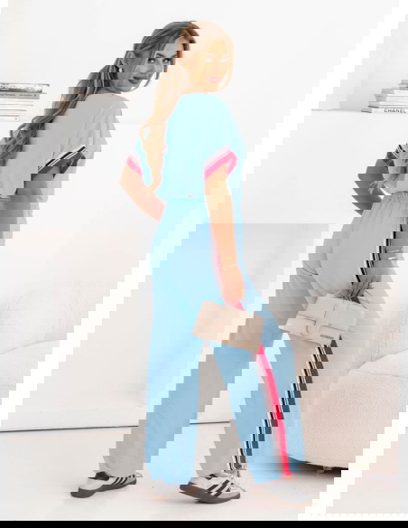 Błękitny komplet koszulka + spodnie Narela to idealna propozycja dla kobiet, które cenią sobie połączenie wygody i stylu w codziennych stylizacjach. Sportowy, ale bardzo modny zestaw, który świetnie sprawdzi się zarówno w domu, jak i na mieście. Błękitna baza została przełamana kontrastowymi lampasami w kolorach czerwieni, bieli i czerni, co dodaje całości wyrazistości i charakteru. Koszulka ma luźny fason i opadające rękawy, dzięki czemu zapewnia swobodę ruchów i wygodę przez cały dzień. Spodnie z wysokim stanem i elastyczną talią idealnie dopasowują się do sylwetki, a szerokie nogawki nadają całości modnego, streetwearowego looku. Styl sportowy z nutą elegancji sprawia, że komplet ten świetnie wpisuje się w najnowsze trendy. To model, po który sięgniesz chętnie, gdy chcesz czuć się komfortowo, ale wyglądać stylowo. Idealny zarówno na szybkie wyjścia, jak i dłuższe aktywne dni. Komplet prezentuje się świeżo, młodzieżowo i z luzem – ale bez przesady. Błękit świetnie współgra z dodatkami w odcieniach beżu, bieli i srebra.