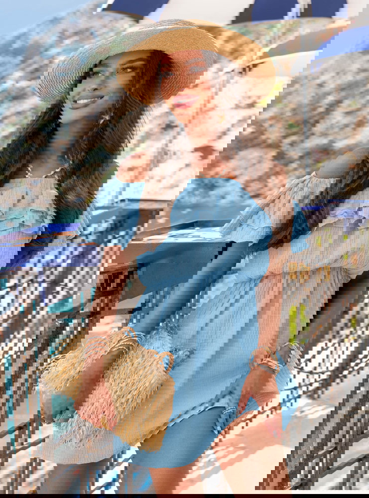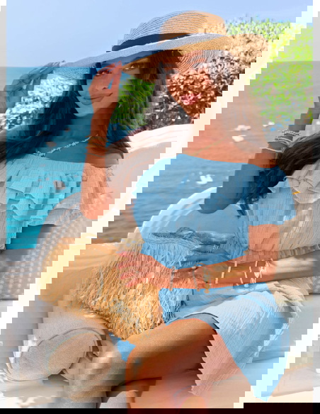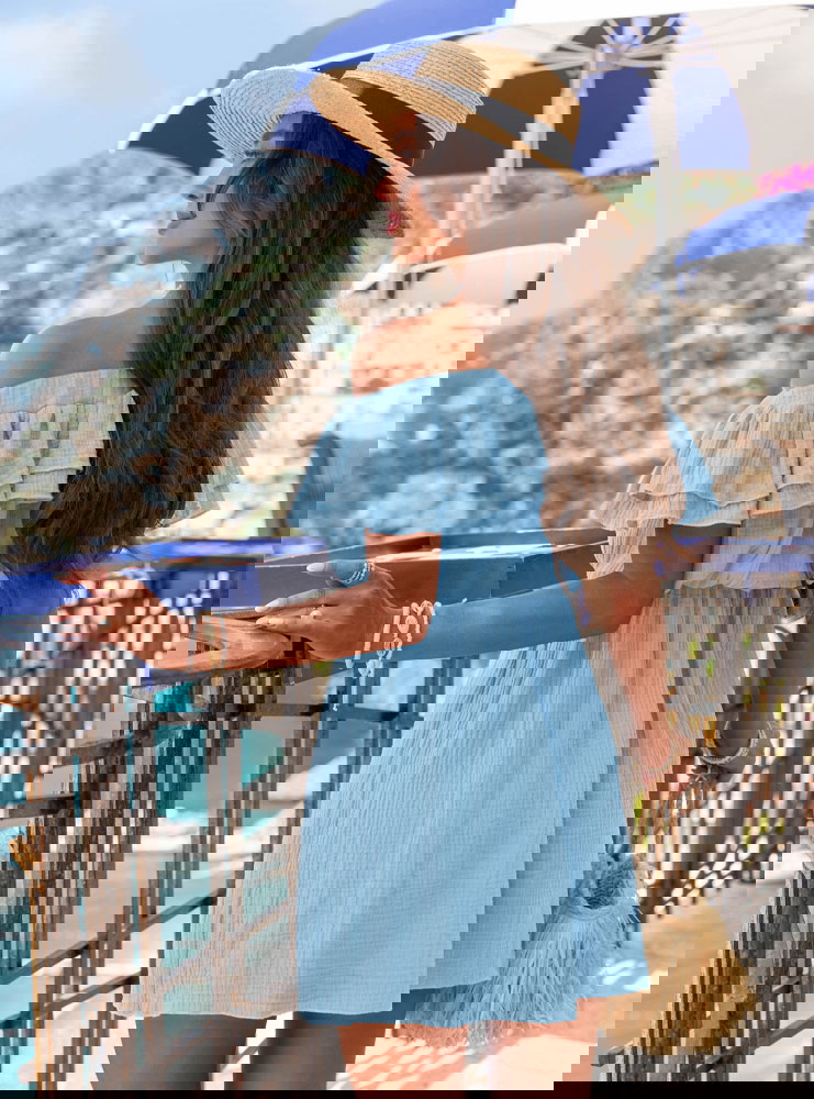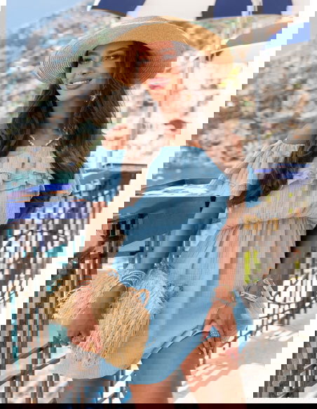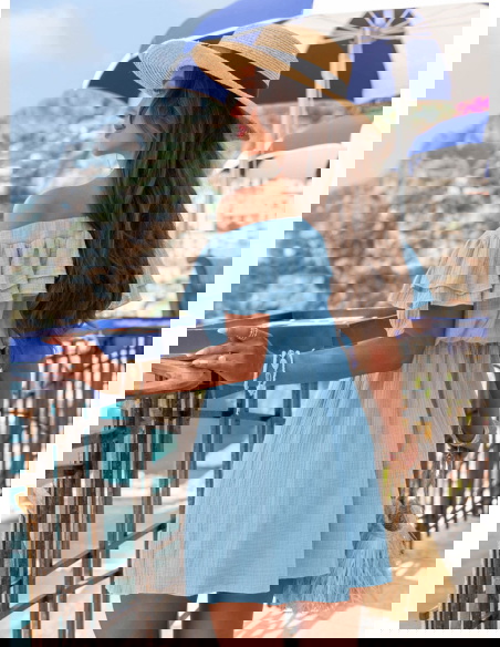 Błękitna sukienka mini typu hiszpanka Onorina to idealna propozycja z letniej kolekcji Positano, która przenosi nas prosto w klimat włoskiego wybrzeża. Jej lekka forma i romantyczne falbany przyciągają wzrok od pierwszego spojrzenia. To model stworzony z myślą o słońcu, spacerach nad brzegiem morza i długich letnich wieczorach. Delikatny odcień błękitu działa kojąco, a zarazem podkreśla naturalną opaleniznę. Krój typu hiszpanka eksponuje ramiona w bardzo subtelny, kobiecy sposób. Gumka w talii podkreśla sylwetkę i dodaje lekkości całej stylizacji. Onorina to sukienka, która sprawdzi się zarówno z espadrylami, jak i sandałkami na obcasie – wszystko zależy od okazji. Dzięki mini długości całość nabiera wakacyjnego charakteru, ale pozostaje elegancka i uniwersalna. Falbany dodają jej uroku i ruchu, co sprawia, że sukienka pięknie prezentuje się w każdej sytuacji. To klasyka w letnim wydaniu – dziewczęca, świeża, ale z klasą.