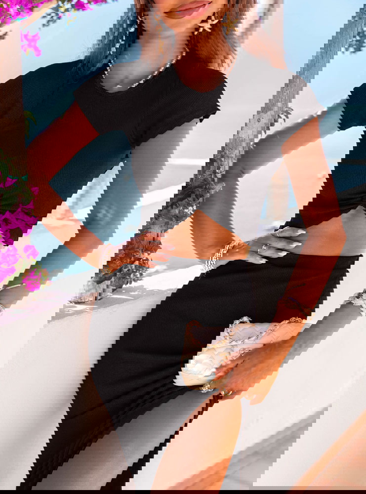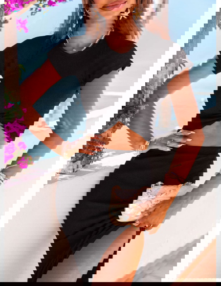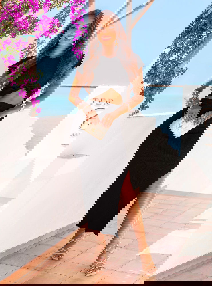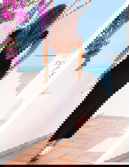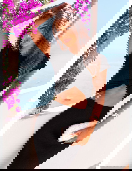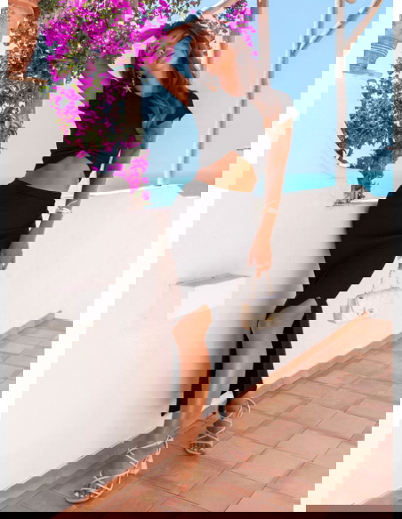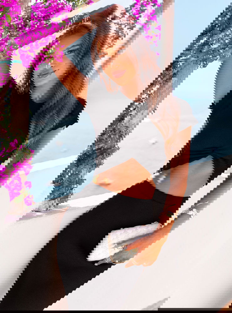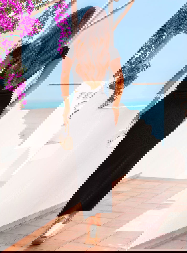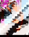 Czarny komplet krótki top + spódnica z rozcięciem Frine to propozycja z kolekcji Positano, która łączy w sobie klasyczną elegancję z nowoczesnym podejściem do letniej mody. Ten zestaw emanuje subtelnym wdziękiem i ponadczasowym szykiem, przyciągając uwagę w nienachalny sposób. Krótszy top z delikatnym skręceniem z przodu subtelnie odsłania talię, dodając stylizacji charakteru. Spódnica o długości maxi pięknie podkreśla sylwetkę, a rozcięcie na nodze wprowadza lekki akcent zmysłowości. Kolor czarny to wybór idealny – uniwersalny, elegancki, zawsze na czasie. Ten komplet świetnie sprawdzi się zarówno podczas letnich wyjazdów, jak i miejskich spacerów. Jest stylowy, ale nie wymaga przesadnego strojenia się – wystarczy kilka dodatków, by stworzyć pełny, efektowny look. Idealnie współgra z wakacyjnym luzem, ale nie traci przy tym na wyrafinowaniu. To zestaw, który łatwo dopasujesz do własnego stylu – niezależnie, czy jesteś fanką minimalizmu, czy modowych eksperymentów. Frine w czerni to klasyka z nutą letniego luzu – idealna baza wielu stylizacji.