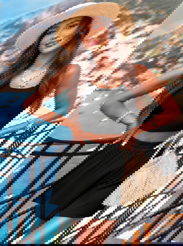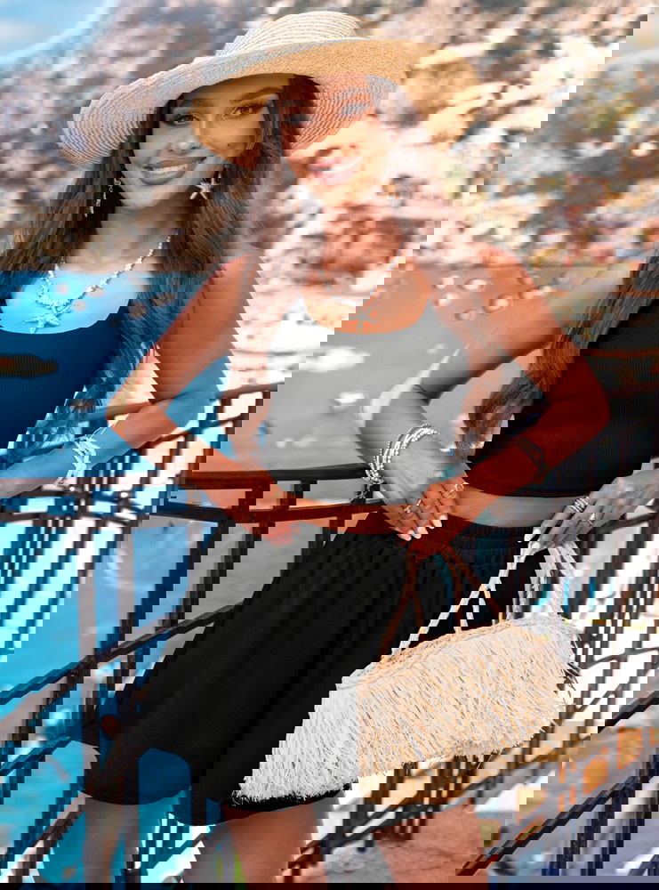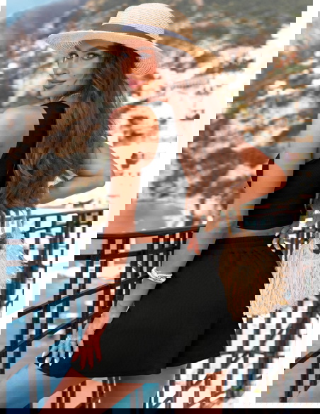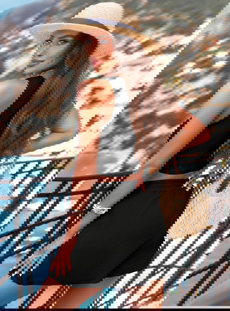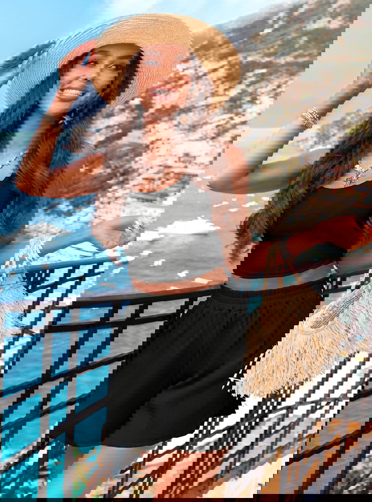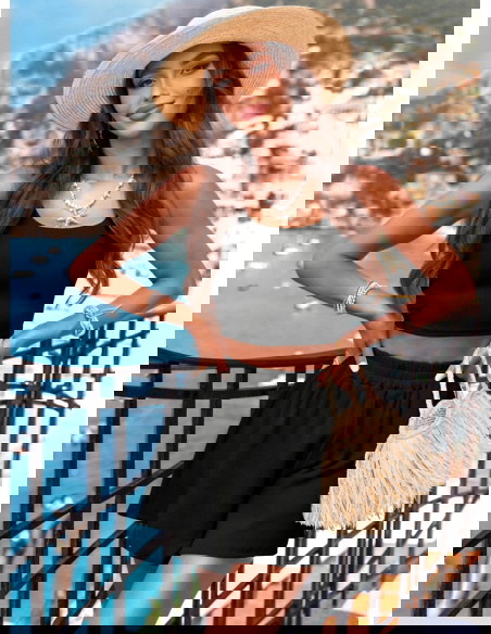 Czarny prążkowany komplet top i spodenki Karminna to modna baza letniej garderoby. Jest wygodny, lekki i bardzo kobiecy. Prosty fason w połączeniu z głębokim kolorem tworzy stylizację, która przyciąga spojrzenia. Komplet świetnie komponuje się z wakacyjnymi dodatkami i można go łatwo dopasować do swojego stylu. To zestaw, który nie wymaga wysiłku – wystarczy założyć i gotowe. Sprawdzi się zarówno na urlopie, jak i w miejskiej wersji codziennej.