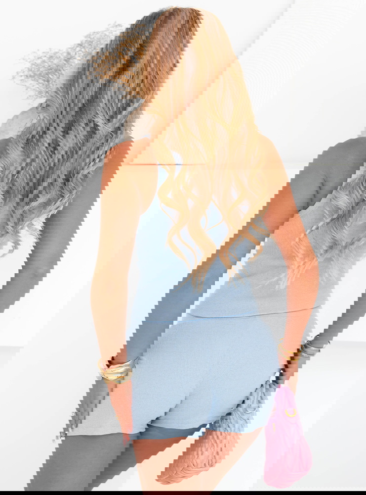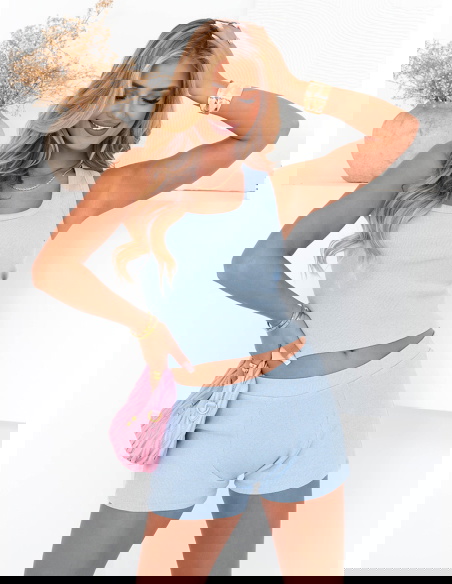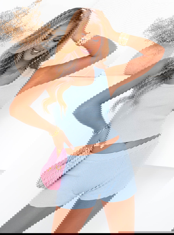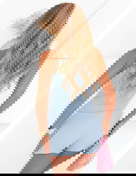 Błękitny komplet top ze spodenkami Goro to idealna propozycja na cieplejsze dni, kiedy chcesz wyglądać świeżo, ale bez zbędnego wysiłku. Ten zestaw łączy w sobie dziewczęcy urok, wygodę i nowoczesny luz. Delikatny odcień błękitu od razu przywodzi na myśl lato, słońce i chwile spędzone na świeżym powietrzu. Komplet składa się z dopasowanego topu na ramiączkach oraz wygodnych spodenek, które zapewniają swobodę i komfort przez cały dzień. Całość prezentuje się niezwykle lekko i stylowo – dokładnie tak, jak lubisz. Ten model daje wiele możliwości stylizacyjnych: możesz nosić go w komplecie albo osobno, tworząc nowe zestawy. Top pięknie eksponuje ramiona i dekolt, a spodenki podkreślają talię. To komplet, który z łatwością dopasujesz do letnich dodatków i ulubionego obuwia. Nie wymaga dużo – wystarczy założyć, by czuć się dobrze i wyglądać świetnie. To must-have dla miłośniczek wakacyjnego minimalizmu z kobiecym twistem.