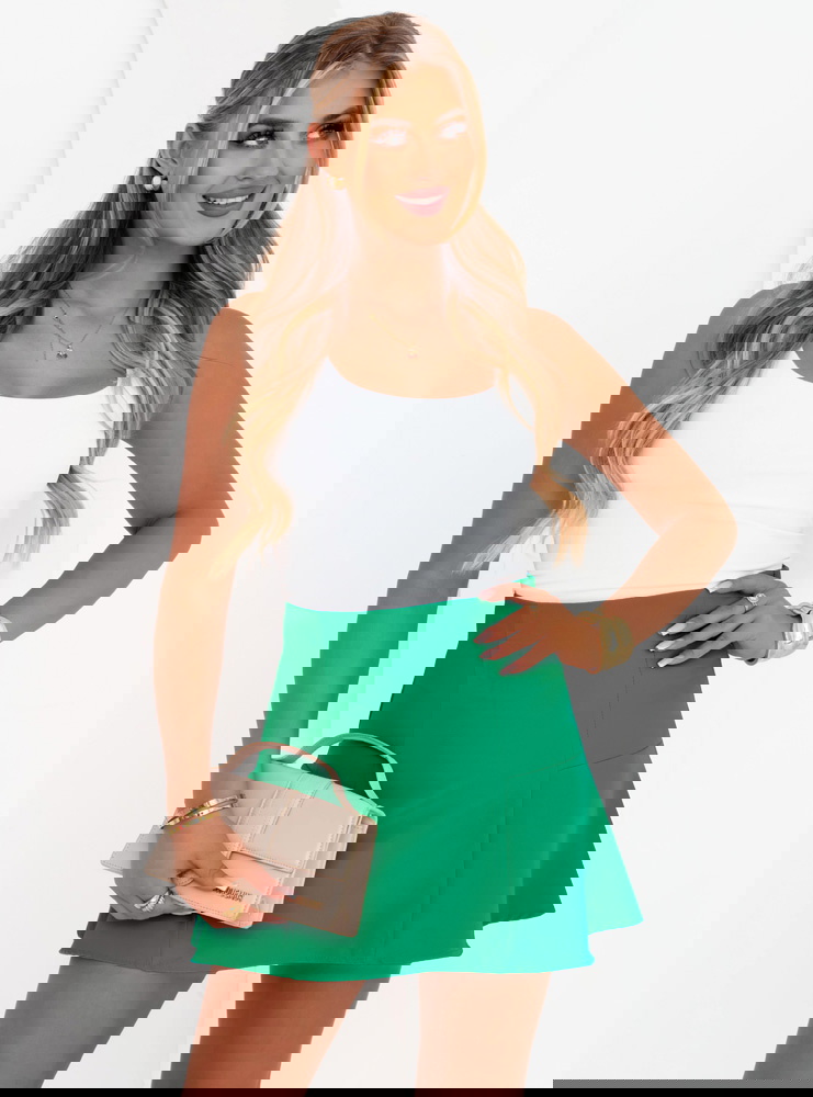 Rozkloszowana spódniczka mini Marlell - butelkowa zieleń to esencja świeżości i kobiecego uroku. Intensywny kolor przyciąga wzrok i sprawia, że nawet najprostszy look nabiera charakteru. To model, który subtelnie podkreśla talię i optycznie wysmukla nogi dzięki delikatnie rozkloszowanemu krojowi. Gładka tkanina pięknie układa się podczas ruchu, dodając sylwetce lekkości i wdzięku. Krój mini świetnie sprawdzi się w letnich stylizacjach – zarówno tych codziennych, jak i bardziej wyjściowych. Minimalistyczny fason bez zbędnych dodatków daje pole do popisu przy doborze akcesoriów. Załóż ją do klasycznego topu, dopasowanego body lub koszuli – i gotowe! Wysoki stan pięknie modeluje sylwetkę i gwarantuje wygodne noszenie przez cały dzień.