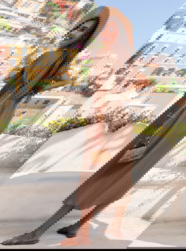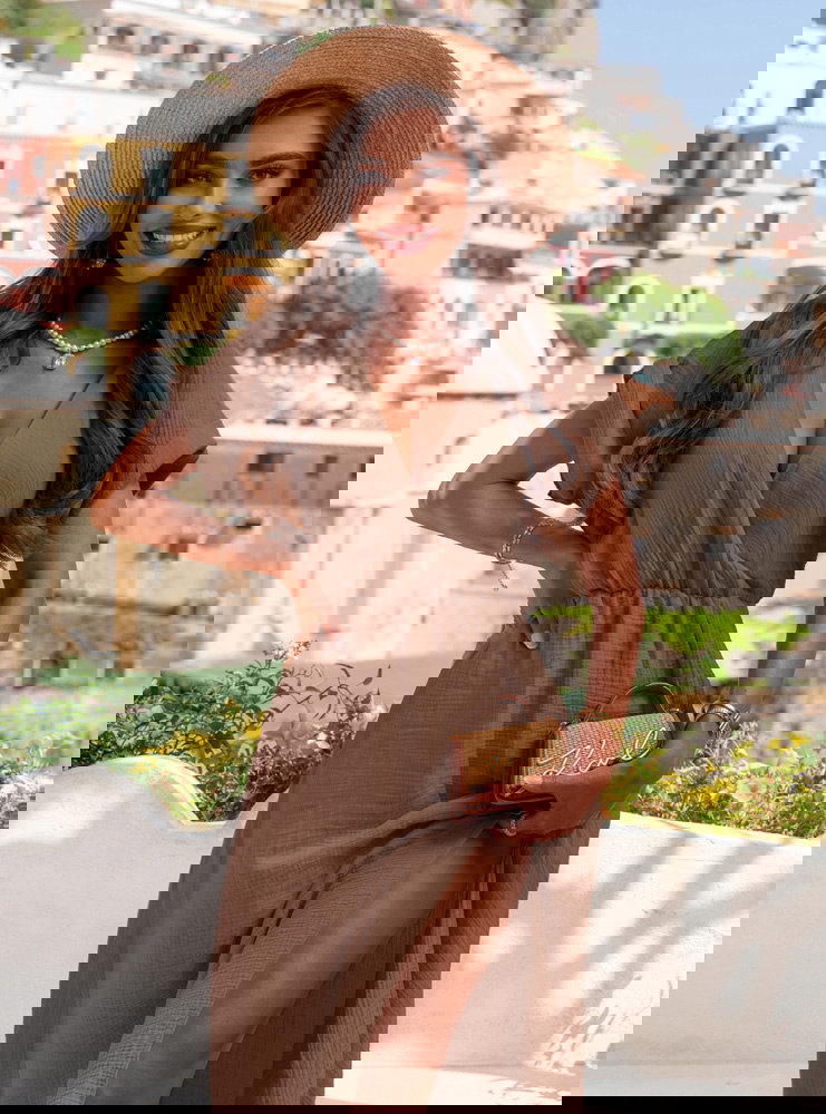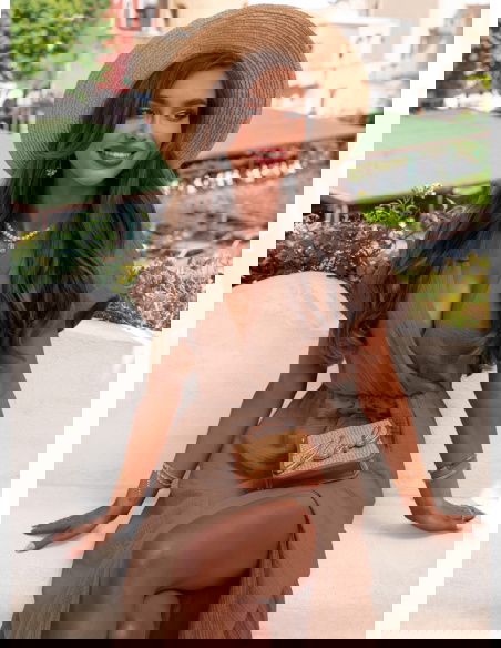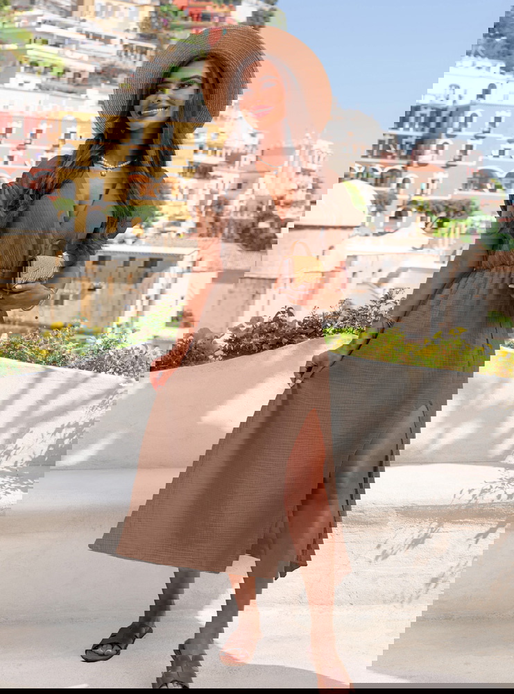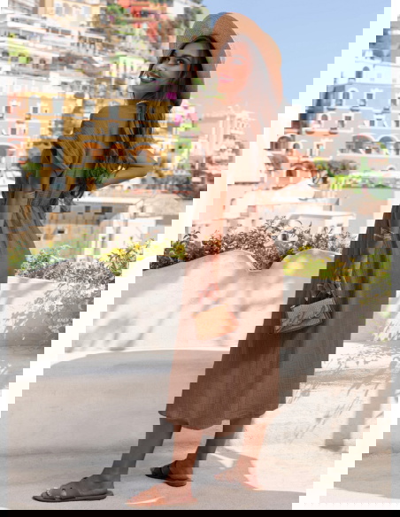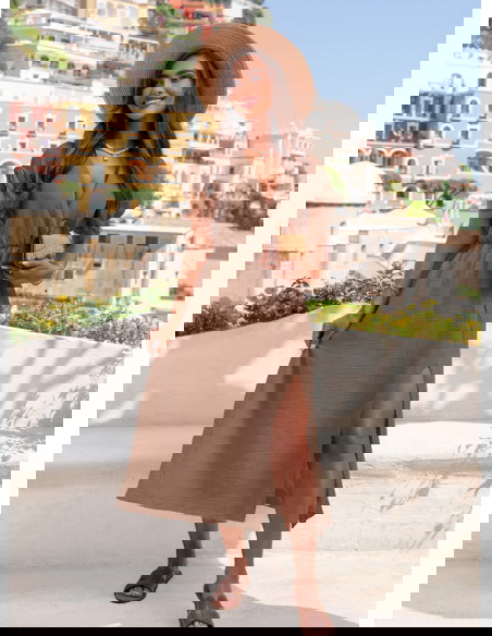 Muślinowa sukienka z przekładanym dekoltem Celeste - mocha mousse to lekka, muślinowa propozycja idealna na lato. Jej swobodny, kobiecy krój sprawia, że będziesz czuła się komfortowo i stylowo w każdej sytuacji. Przekładany dekolt typu kopertowego pięknie podkreśla biust, subtelnie eksponując dekolt. Sukienka posiada luźne, krótkie rękawy i elastyczną talię, która optycznie wysmukla sylwetkę. Zwiewny, oddychający materiał idealnie sprawdza się podczas upałów. Długość midi z rozcięciem z przodu dodaje lekkości i kobiecego wdzięku. Mocha mousse to klasyczny, ciepły odcień, który pasuje do wielu typów urody i łatwo zestawia się z dodatkami. Model Celeste to połączenie wygody, elegancji i letniej świeżości. Sprawdzi się zarówno na spacer po plaży, jak i na kolację w letniej restauracji. Uniwersalna i ponadczasowa – idealna na każdą okazję.