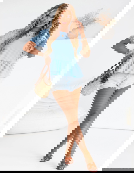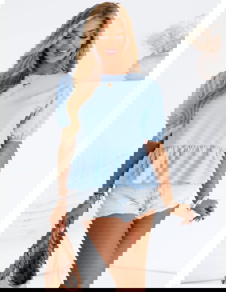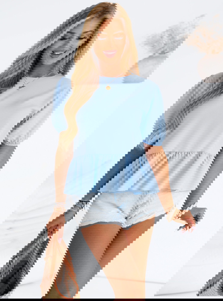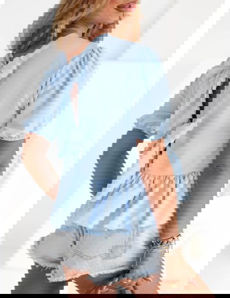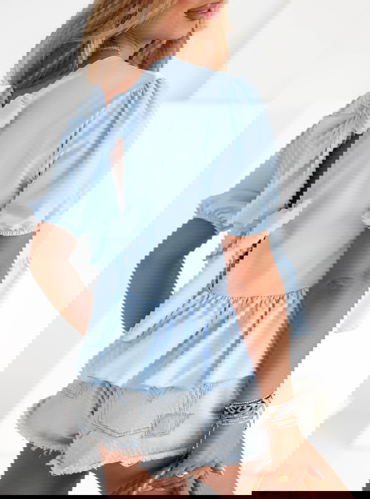 Błękitna bluzka z ozdobnym wiązaniem na plecach Kayleah to połączenie klasyki i modnego detalu. Dzięki niej stworzysz stylizacje pełne kobiecego uroku i oryginalności. Doskonale komponuje się z różnymi elementami garderoby. To must-have dla każdej modnej kobiety, która chce poczuć się wyjątkowo. Wzbogać swoją szafę o ten stylowy i praktyczny element!