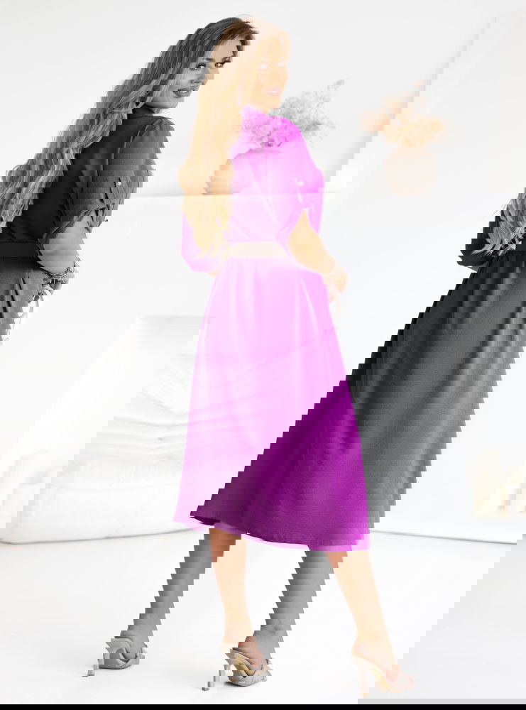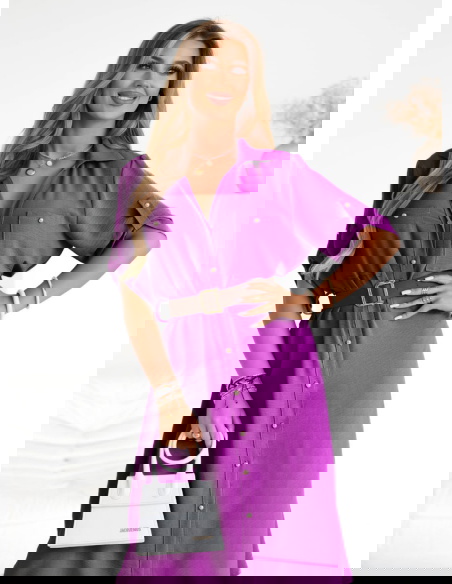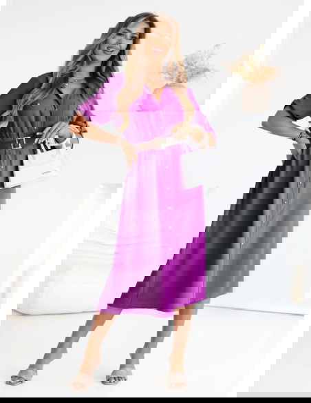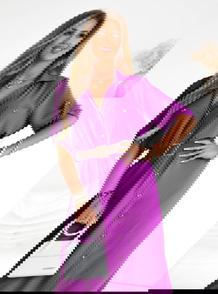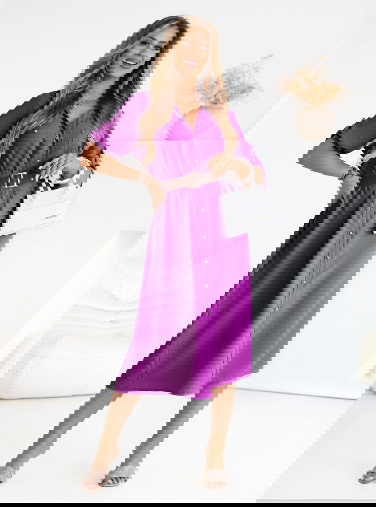 Sukienka midi z paskiem Jorien - fuksja to kwintesencja stylu i wygody, którą pokochasz na każdą porę dnia. Jej intensywny fioletowy kolor przyciąga wzrok i dodaje energii każdej stylizacji. Idealnie dopasowany pasek podkreśla talię, tworząc kobiecą sylwetkę, a wygodna długość midi pozwala poczuć się swobodnie i elegancko zarazem. Guziki z przodu dodają sukience klasycznej nuty, a rękawy do łokcia z możliwością podpięcia sprawiają, że możesz dostosować ją do swoich potrzeb. Jej uniwersalność pozwala na stylizacje casualowe i bardziej eleganckie, w zależności od dodatków. Sprawdzi się podczas ciepłych dni i wieczorów, oferując komfort i modny wygląd. Dzięki możliwości podpięcia rękawów możesz dopasować ją do temperatury i własnych preferencji. To propozycja dla kobiet aktywnych, które nie chcą rezygnować ze stylu.