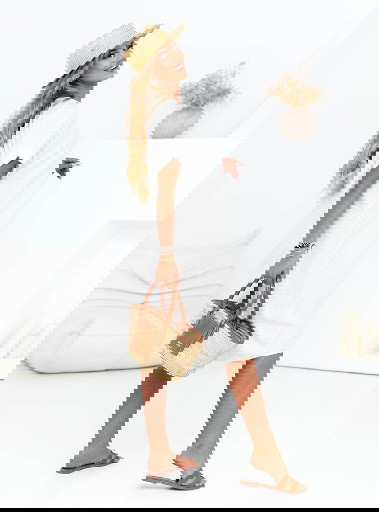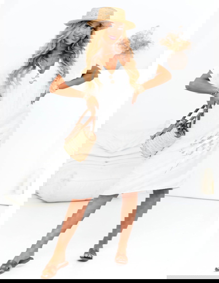 Biała sukienka oversize z ozdobnymi guzikami Camellia to idealna propozycja dla kobiet ceniących sobie komfort i swobodę, bez rezygnacji z modnego wyglądu. Jej luźny fason doskonale sprawdzi się w gorące, letnie dni, zapewniając przewiewność i wygodę. Ozdobne guziki przy dekolcie dodają sukience subtelnego uroku i oryginalności. Model Camellia łączy casualowy styl z kobiecą delikatnością, co czyni ją doskonałym wyborem na różne okazje. Z łatwością dopasujesz ją do codziennych stylizacji, jak i wakacyjnych wyjazdów. Ta sukienka to doskonały sposób na szybkie stworzenie modnego, a jednocześnie wygodnego outfitu. Jej uniwersalny charakter pozwala na łączenie z różnorodnymi dodatkami i obuwiem. Camellia to sukienka, która nie przytłacza, a podkreśla lekkość i naturalność.