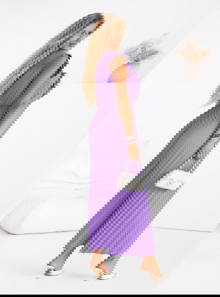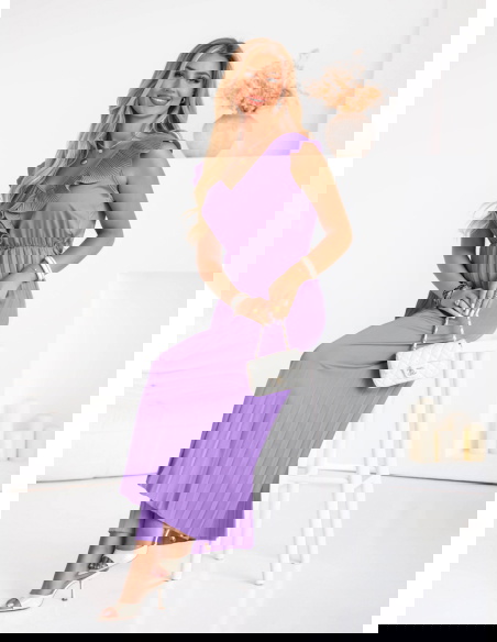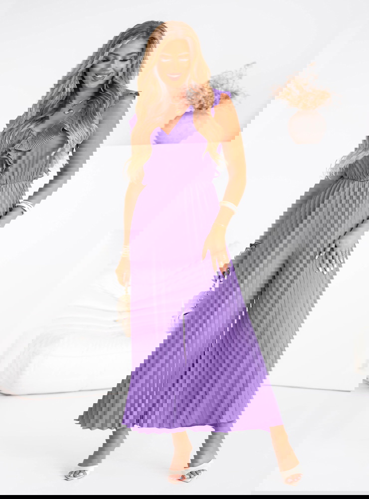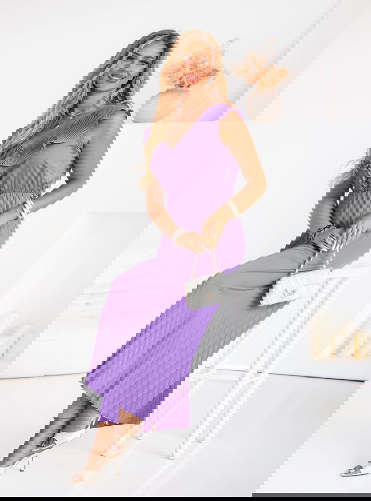 Liliowy plisowany kombinezon z falbankami Cattela to połączenie elegancji, wygody i modnego fasonu. Plisowany materiał i falbanki tworzą wyjątkowy, kobiecy look, który doskonale wpisuje się w letnie trendy. Dzięki swojej uniwersalności można go stylizować zarówno na co dzień, jak i na bardziej eleganckie okazje. Jego lekka i przewiewna tkanina zapewni wygodę nawet w gorące dni, a modny fason pozwoli Ci czuć się stylowo i swobodnie.