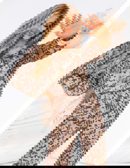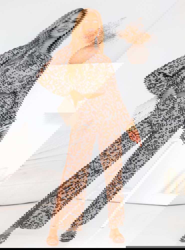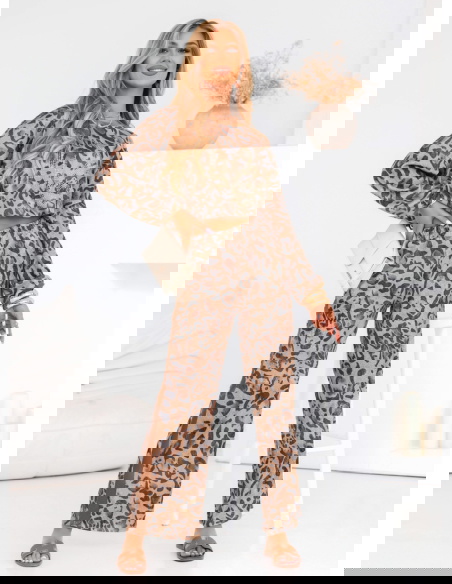 Komplet bluza i spodnie Deodoza to propozycja dla odważnych kobiet, które pragną dodać swojej garderobie odrobinę dzikości i energii. Panterkowy wzór sprawia, że zestaw zyskuje charakter, jednocześnie pozostając wygodnym i praktycznym na co dzień. Bluza o luźnym kroju w połączeniu z szerokimi spodniami tworzy idealny balans pomiędzy modą a komfortem. Dodatkowo, spodnie posiadają subtelne rozcięcia na bokach, które nadają całości lekkości i sprawiają, że cała stylizacja nabiera dynamicznego charakteru. W tym komplecie poczujesz się swobodnie, ale i kobieco, z łatwością przechodząc z jednego stylu do drugiego, nie rezygnując przy tym z modnego wyglądu.