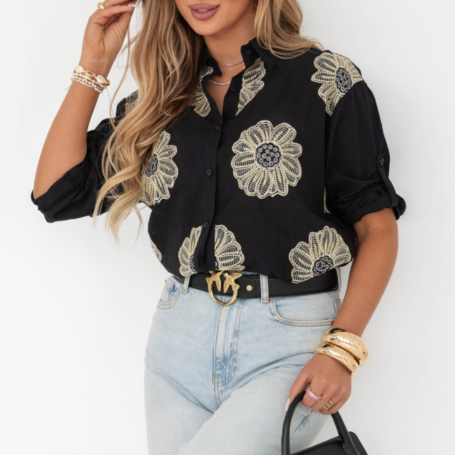 Czarna koszula w kwiaty Laurelei to doskonały wybór dla kobiet, które cenią elegancję w połączeniu z nutą romantyzmu. Dzięki haftowi w kształcie kwiatów w odcieniach żółci zyskuje ona subtelną, ale wyróżniającą się ozdobę. Z klasycznym krojem, zawiązaniem na dole i luźnym fasonem, koszula jest wygodna, a jednocześnie stylowa. Świetnie komponuje się z dżinsami, spódnicami i innymi elementami garderoby, tworząc wiele modowych kombinacji.