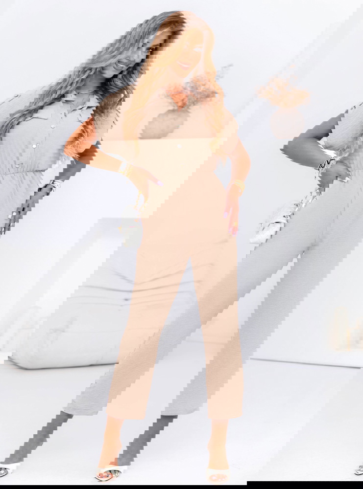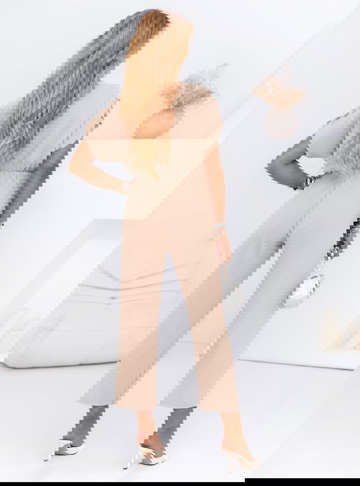 Beżowy kombinezon z guzikami na krótki rękaw Kensey to elegancka, a jednocześnie komfortowa opcja na letnie dni, łącząca w sobie klasyczny design z modnymi akcentami. Wykonany z lekkiego materiału, gwarantuje wygodę noszenia przez cały dzień, a jego prosty, ale efektowny krój sprawia, że można go stylizować na różne sposoby. Długie guziki w górnej części nadają mu odrobinę elegancji, a krótki rękaw sprawia, że jest to idealna propozycja na cieplejsze dni. Subtelny kolor doskonale pasuje do wielu innych odcieni, tworząc bazę do wielu stylizacji. Wiązanie w talii pozwala na dopasowanie go do sylwetki, podkreślając jej atuty.