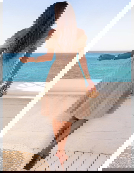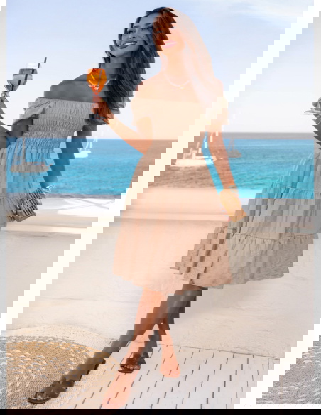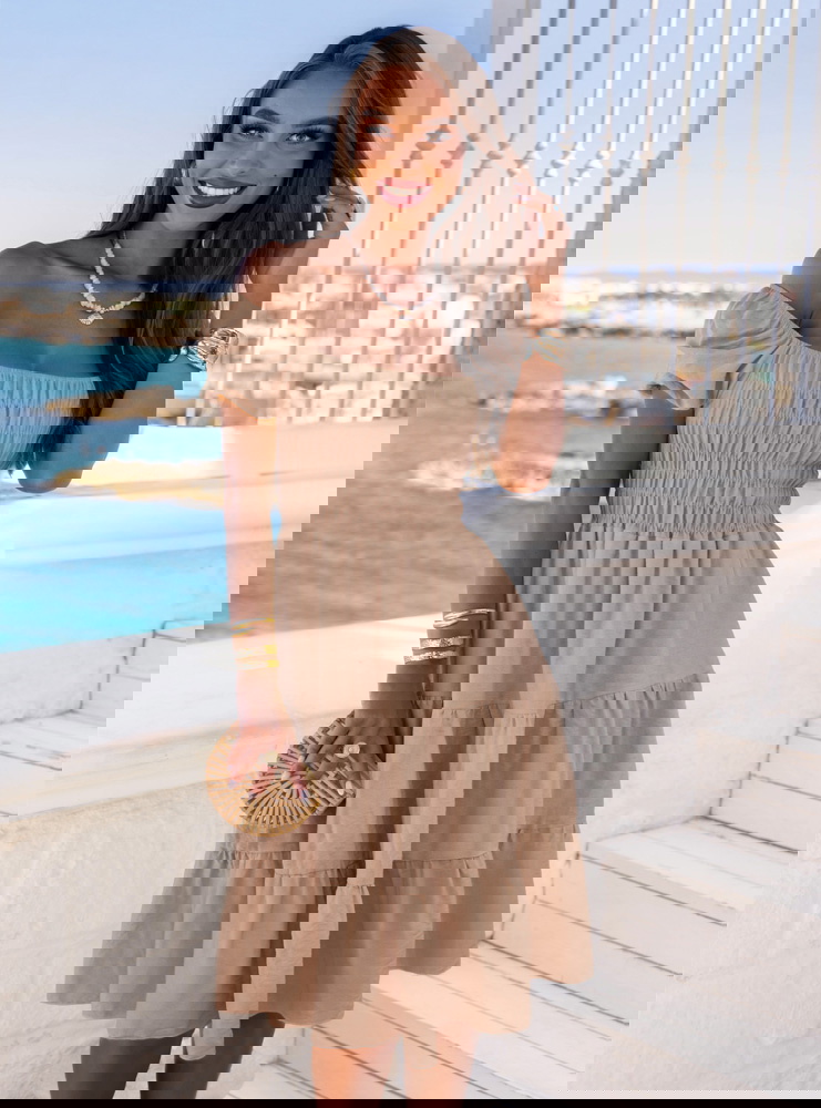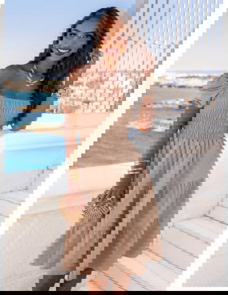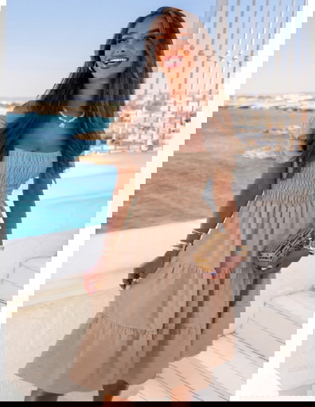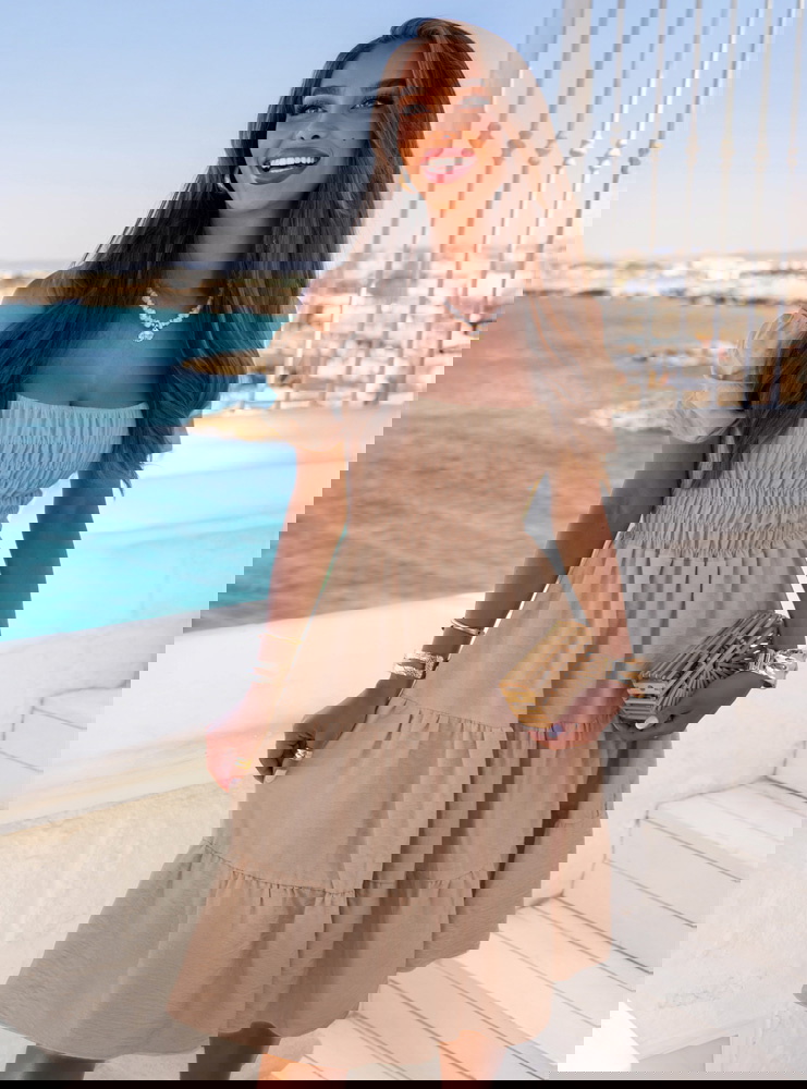 Sukienka midi typu hiszpanka Melindaa - mocha mousse to wybór świadomej kobiety, która ceni styl, ale nie rezygnuje z wygody. Jej uniwersalność sprawia, że można ją nosić niemal wszędzie. W kolekcji Dolce Vita to model, który idealnie uzupełnia wakacyjną garderobę. Ma w sobie coś ponadczasowego, a jednocześnie bardzo aktualnego. Możesz ją spakować na każdy wyjazd – i mieć pewność, że się sprawdzi. To sukienka, w której czujesz się dobrze – tak po prostu, bez względu na miejsce czy porę dnia.