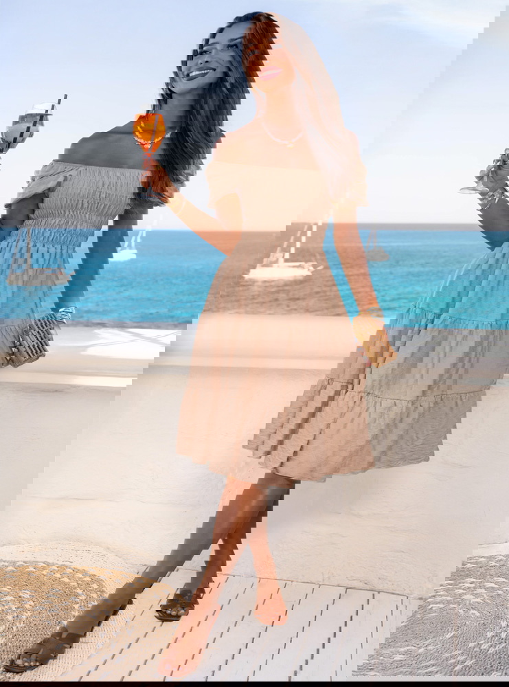 Sukienka midi typu hiszpanka Melindaa - mocha mousse to idealny wybór, gdy szukasz balansu między klasyką a letnią nonszalancją. Jej stonowany, ciepły odcień inspirowany kawą z mlekiem świetnie podkreśla opaleniznę i pasuje do wielu dodatków. Model łączy kobiecość z luzem – wystarczy spojrzeć na opadające rękawy i marszczoną górę, która pięknie dopasowuje się do sylwetki. To sukienka, którą po prostu chce się nosić – na co dzień, na wyjeździe, albo podczas spokojnego weekendu. Rozkloszowany dół nadaje jej lekkości, a jednocześnie tworzy zwiewną, subtelną formę. Idealna na spacery promenadą, jak i popołudniową kawę w ulubionej kawiarni. Styl boho przełamany nutą miejskiej elegancji tworzy look, który odnajdzie się w każdej wakacyjnej walizce. Jej urok tkwi w prostocie – ale to ta świadoma, dopracowana prostota, która zawsze się sprawdza. Z kolekcji Dolce Vita, ta sukienka to ukłon w stronę relaksu i swobodnego stylu życia. Spędź dzień z filiżanką espresso w dłoni i modą, która daje Ci pełną swobodę.