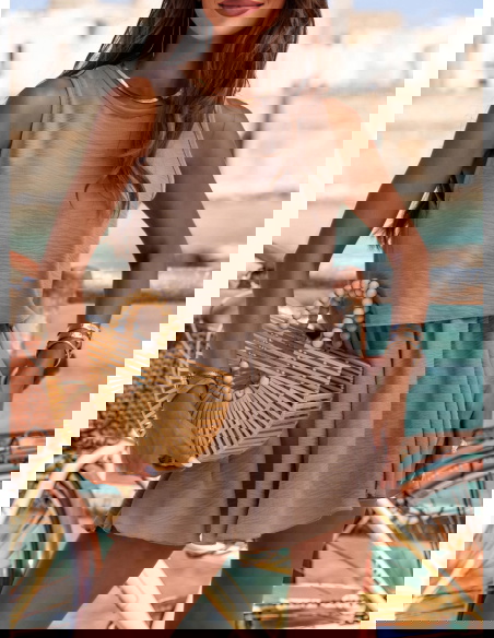 Komplet bluzka i spodenki Kammilma - mocha mousse to stylowy duet, który pokochasz za jego lekkość, prostotę i uniwersalność. To propozycja, która świetnie sprawdzi się w każdej wakacyjnej garderobie – niezależnie od tego, czy planujesz plażowanie, spacer po miasteczku, czy chill przy kawie. Kolor mocha mousse to subtelna, ciepła alternatywa dla klasycznych beżów – spokojny, ale z charakterem. Luźna bluzka swobodnie opada na sylwetkę, nadając całości lekkiego, nonszalanckiego efektu. Spodenki z elastyczną talią i delikatnie rozkloszowanym dołem pięknie układają się przy ruchu i zapewniają komfort noszenia. To komplet, który łatwo wystylizujesz – wystarczą wiklinowa torebka, okulary i delikatna biżuteria. Minimalistyczna forma pozwala na zabawę dodatkami, ale sam w sobie prezentuje się bardzo elegancko. Może towarzyszyć Ci w podróży, w mieście, na urlopie – wszędzie, gdzie chcesz wyglądać dobrze i czuć się swobodnie. Idealny zestaw na ciepłe dni, w których liczy się wygoda, ale bez kompromisu ze stylem.