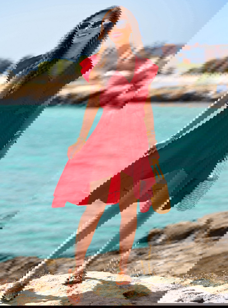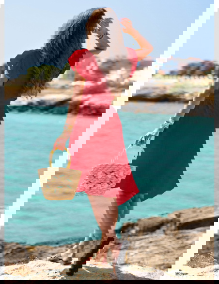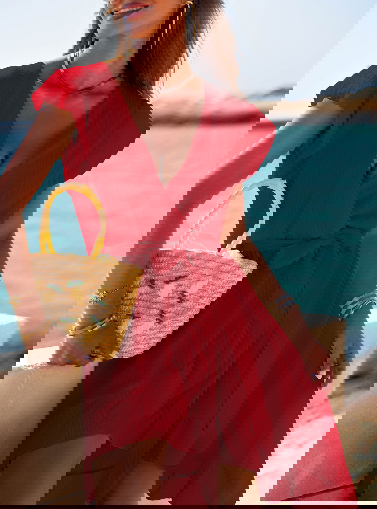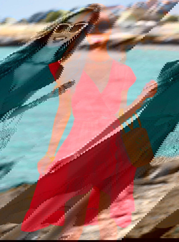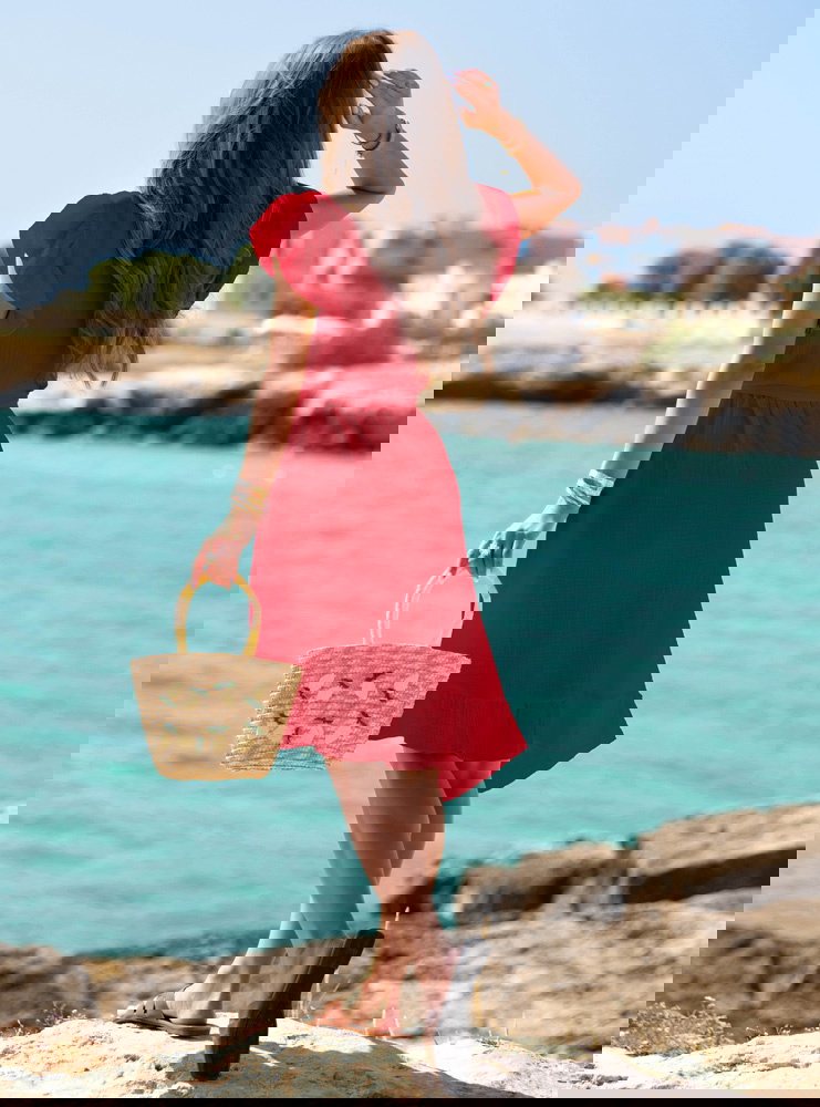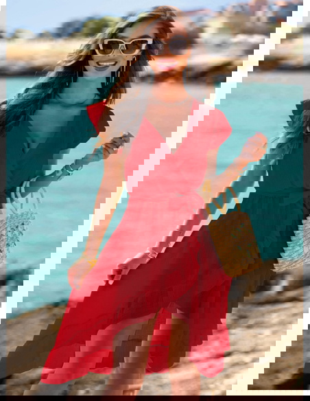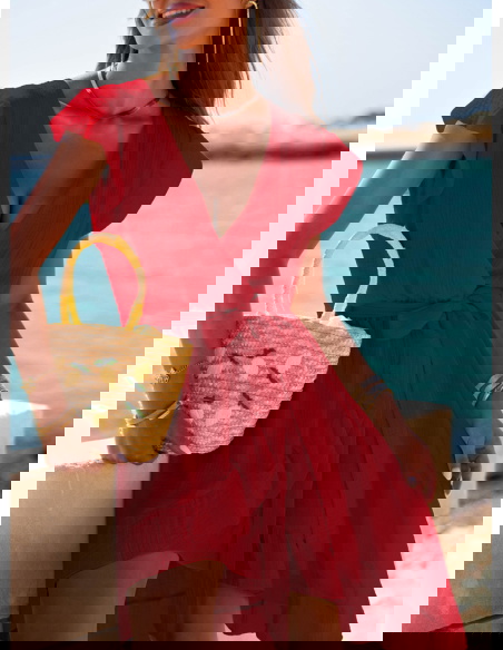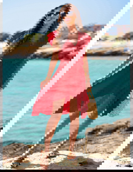 Malinowa muślinowa asymetryczna sukienka z wiązaniem Trasea to propozycja, która łączy kobiecość, lekkość i nutę włoskiego temperamentu. Intensywny malinowy kolor przyciąga spojrzenia, ale nie jest nachalny – to barwa, która dodaje energii i świetnie współgra z letnim klimatem. Sukienka ma głęboki, kopertowy dekolt i delikatnie opadające rękawy, co sprawia, że wygląda niezwykle zmysłowo, ale nadal z klasą. Wiązanie w pasie pozwala podkreślić talię i dopasować krój do sylwetki. Asymetryczny dół z falbaną pięknie faluje przy każdym kroku, tworząc efekt lekkości i swobody. To model, który sprawdzi się zarówno w ruchu, jak i podczas spokojnych chwil przy kawie czy spacerze. Wakacyjny klimat czuć tu w każdym detalu – od przewiewnego fasonu, po zwiewny krój i subtelne wykończenia. Ta sukienka to esencja kolekcji - stylowa, ale niewymuszona, pełna włoskiego luzu. Nosząc ją, nie potrzebujesz wielu dodatków – ona sama gra główną rolę. Idealna dla kobiet, które kochają czuć się wyjątkowo bez przesady.