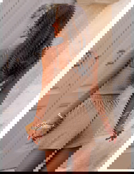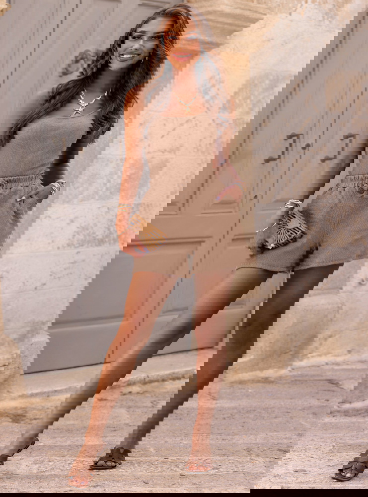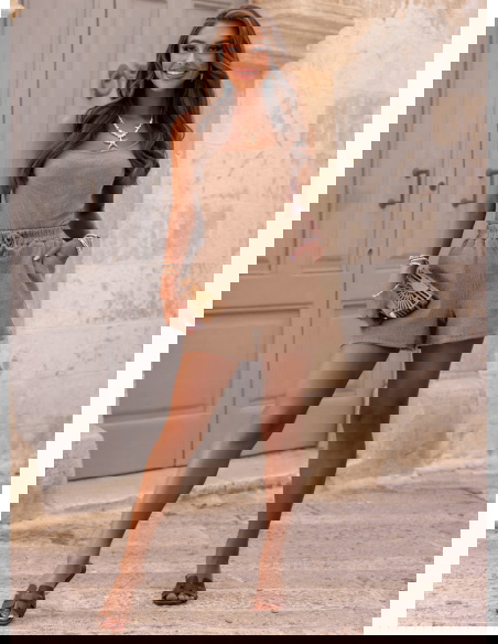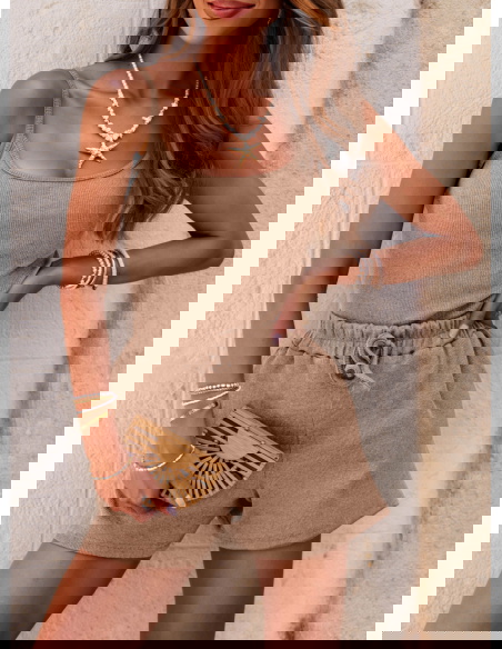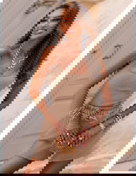 Beżowy prążkowany komplet bluzka na ramiączkach + spodenki Zarellato idealna odpowiedź na letnie potrzeby – wygodny, kobiecy i łatwy do wystylizowania. Zachwyca prostotą, ale ma w sobie modowy charakter. Możesz go nosić na wiele sposobów, zmieniając dodatki w zależności od okazji. Świetnie łączy się z innymi elementami z szafy, dlatego z pewnością często po niego sięgniesz. W kolekcji La Dolce Vita ten model podkreśla ducha sezonu: beztroskiego, ale dopracowanego. Stylowa alternatywa dla sukienek i kombinezonów. Jeśli marzysz o zestawie, w którym poczujesz się lekko i swobodnie – to właśnie ten komplet.