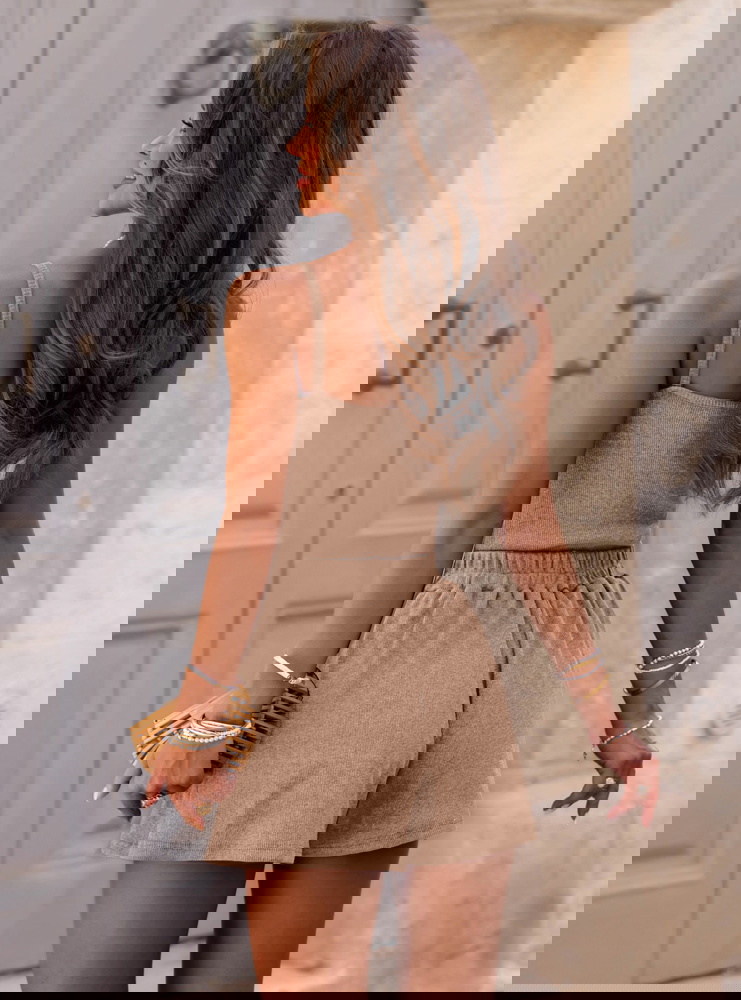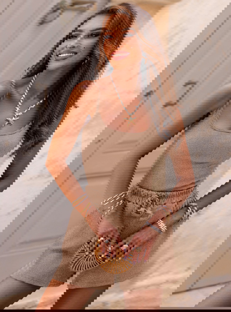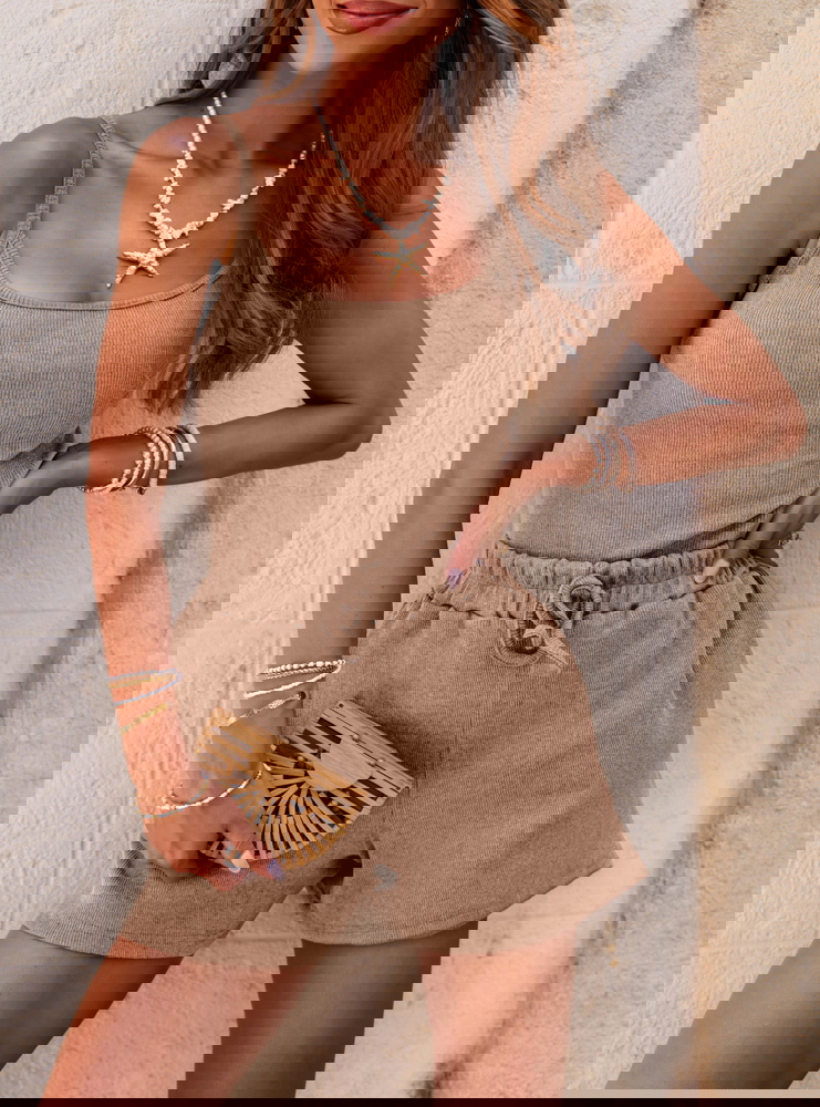 Beżowy prążkowany komplet bluzka na ramiączkach + spodenki Zarella to prawdziwa definicja letniego komfortu i stylu. Ten zestaw urzeka prostotą, a jednocześnie prezentuje się niezwykle kobieco. Beżowy kolor świetnie współgra z opaloną skórą, podkreślając naturalną urodę. Prążkowana struktura dodaje nowoczesności i sprawia, że całość wygląda bardzo świeżo. Bluzka na cienkich ramiączkach subtelnie odsłania ramiona i dekolt, nadając sylwetce lekkości. Spodenki z elastyczną talią i wiązaniem to wygoda w najlepszym wydaniu – sprawdzą się zarówno na wakacjach, jak i w mieście. Komplet można nosić razem lub rozdzielić – daje to wiele możliwości stylizacji. To opcja dla kobiet, które cenią styl bez wysiłku i chcą wyglądać świetnie bez przesady. Kolekcja La Dolce Vita stawia na lekkość i przyjemność z noszenia – dokładnie to znajdziesz w tym zestawie. Delikatny, ale zauważalny – komplet, który łatwo polubić.