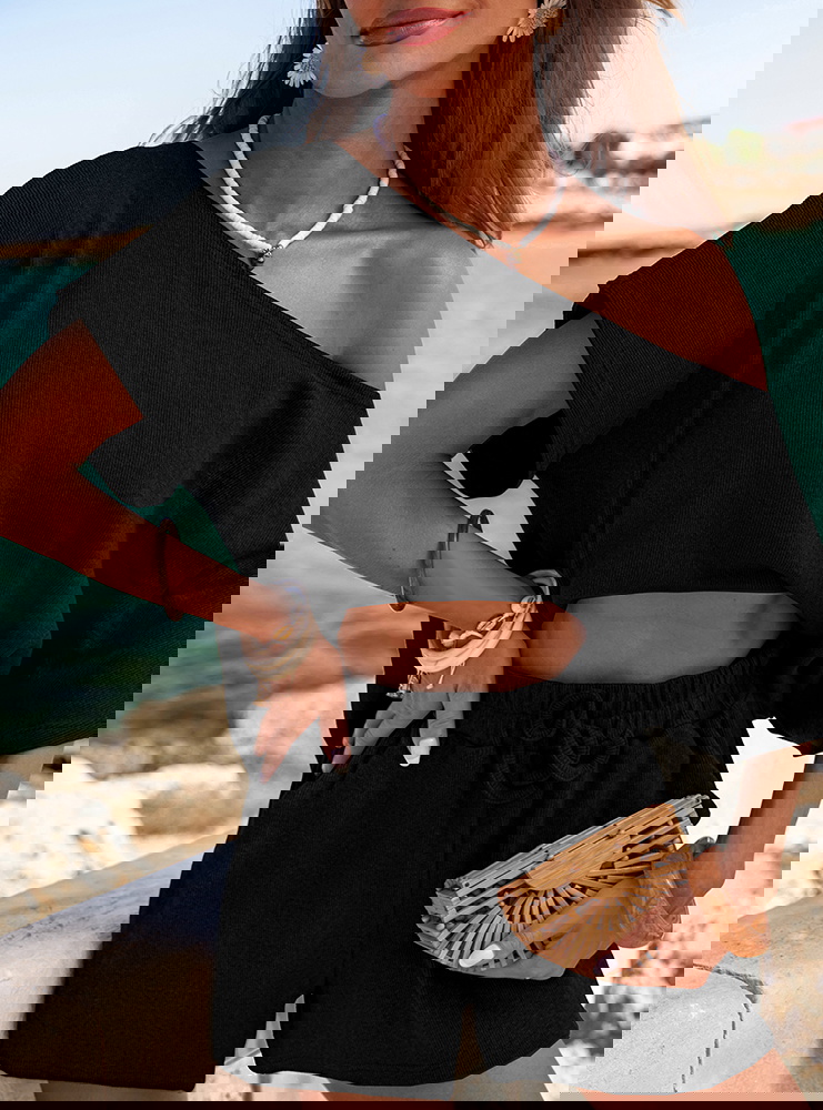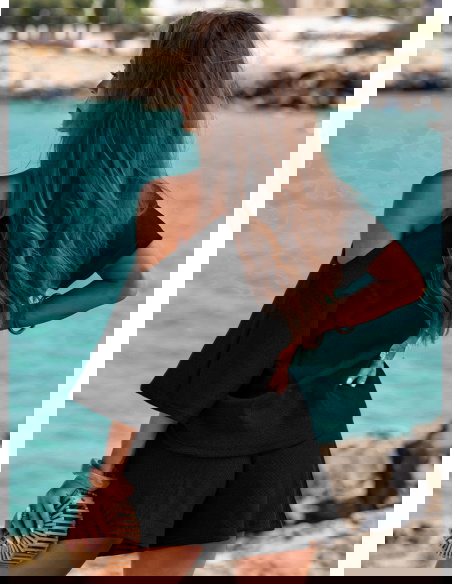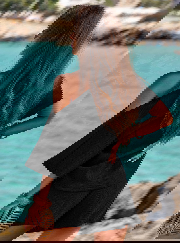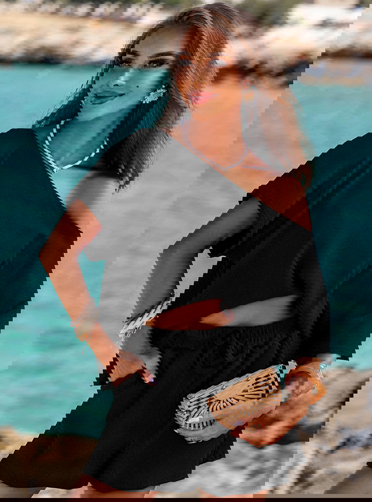 Czarny prążkowany komplet top i spodenki z gumką w pasie Luxia to definicja minimalistycznego szyku. Dzięki prostemu krojowi i prążkowanej strukturze prezentuje się stylowo i świeżo. Będzie Twoim ulubionym letnim zestawem, który po prostu się sprawdza. Możesz w nim spacerować, podróżować, relaksować się lub załatwiać codzienne sprawy – i za każdym razem wyglądać świetnie. Czerń daje swobodę w doborze dodatków, ale sama w sobie robi wrażenie. To komplet, który daje luz, ale nie rezygnuje z kobiecości. Jeśli cenisz wygodę, ale lubisz wyglądać modnie – ten zestaw będzie Twoim wakacyjnym pewniakiem.