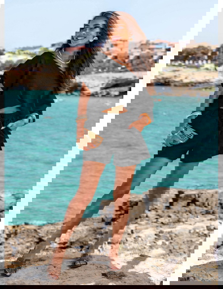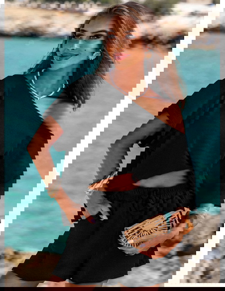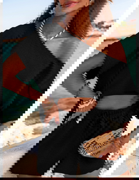 Czarny prążkowany komplet top i spodenki z gumką w pasie Luxia to propozycja, która łączy kobiecy luz z elegancją ukrytą w prostocie. Ten zestaw nie potrzebuje dodatków, by przyciągać uwagę – wystarczy spojrzenie. Czerń dodaje mu klasy i uniwersalności, dzięki czemu sprawdzi się w wielu codziennych sytuacjach. To ubranie, w którym możesz czuć się swobodnie, ale wyglądać bardzo stylowo. Oversize’owy top z lekko opadającym ramieniem i luźne szorty tworzą harmonijną całość, która działa na sylwetkę jak modowy filtr. Prążkowana faktura dodaje głębi, ale nie przytłacza. To komplet idealny na dni, kiedy nie chcesz się zastanawiać "w co się ubrać", a jednocześnie pragniesz wyglądać świetnie. Pasuje do stylu życia w rytmie slow – bez pośpiechu, ale z klasą. Świetnie oddaje klimat miejskiego lata, spacerów w promieniach słońca i spontanicznych wyjść. Jest wygodny, ale ma w sobie coś wyjątkowego – właśnie to coś, co nazywamy La Dolce Vita.