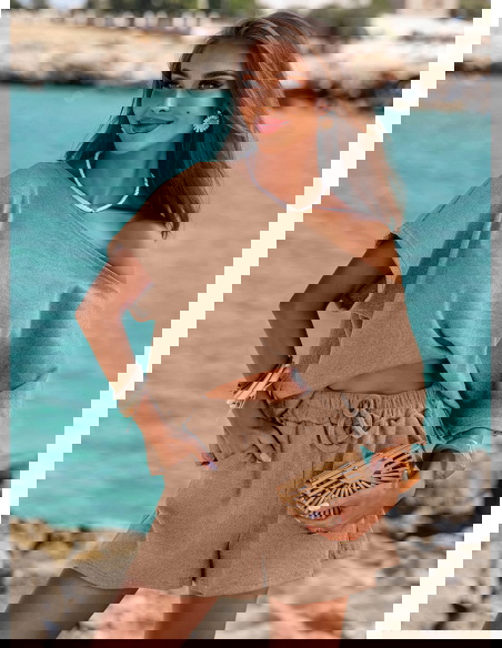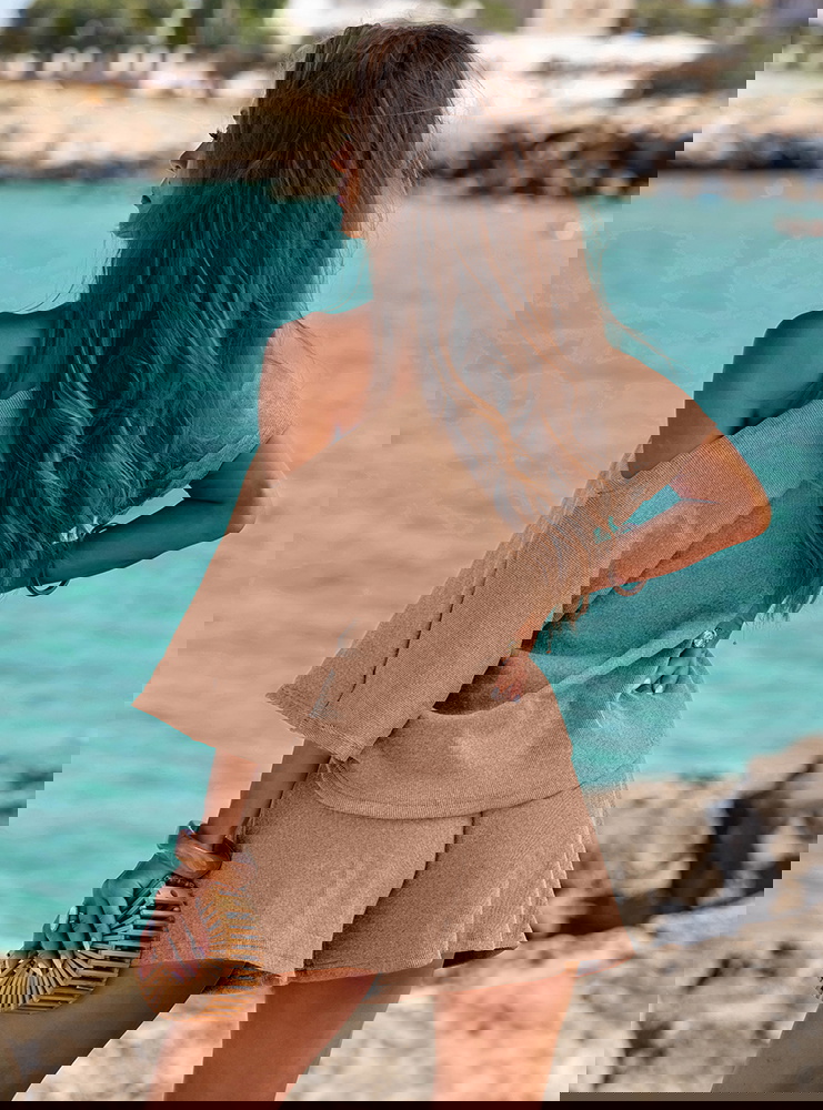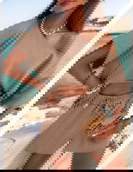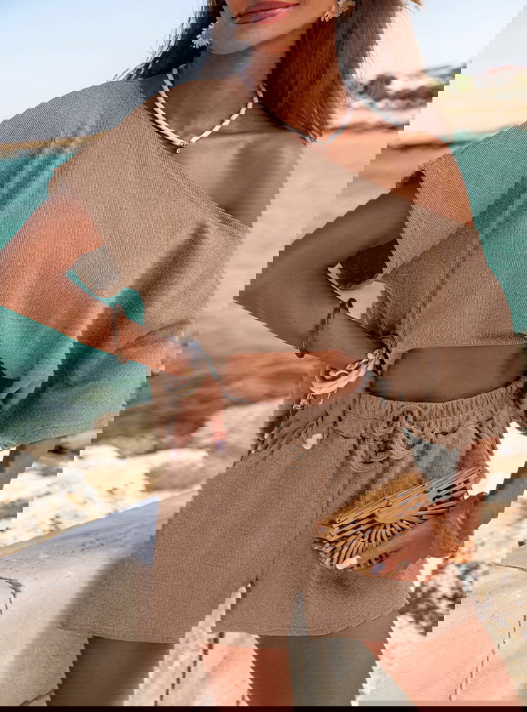 Beżowy prążkowany komplet top i spodenki z gumką w pasie Luxia to synonim letniego minimalizmu z klasą. Jest wygodny, ale nie banalny – sprawdza się wszędzie tam, gdzie liczy się luz i styl. Jasny kolor pasuje do wielu innych barw, co daje mnóstwo opcji stylizacyjnych. Dzięki prostocie formy można dopasować go do różnych dodatków – od sandałów po espadryle. To zestaw, który zostaje z Tobą na dłużej – nie tylko latem. Prążkowana struktura dodaje mu modowego charakteru, ale bez przesady. Idealny wybór, jeśli szukasz stylizacji w duchu „mniej znaczy więcej”.
