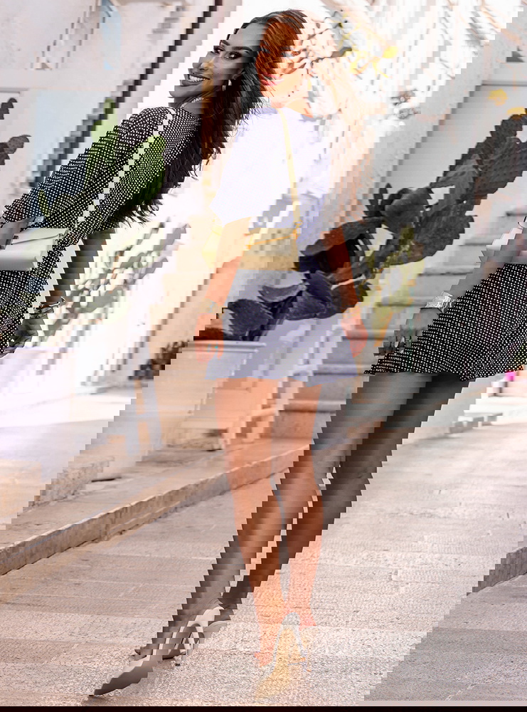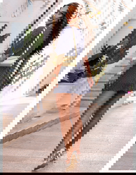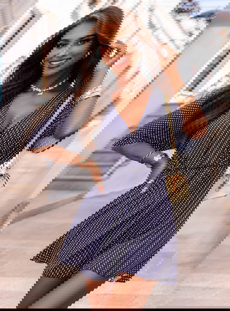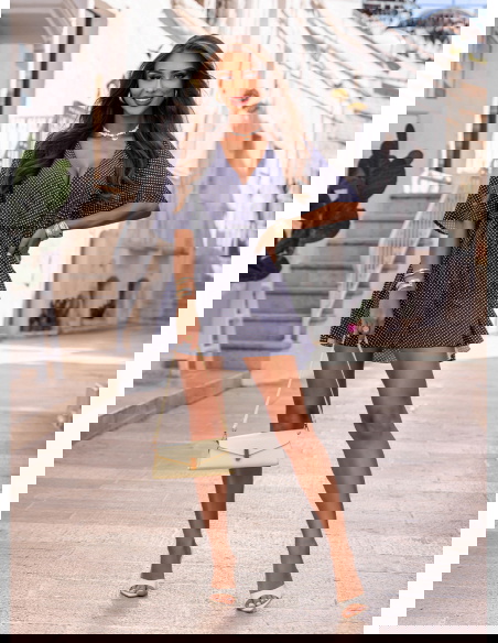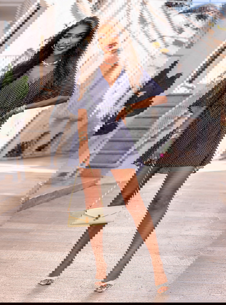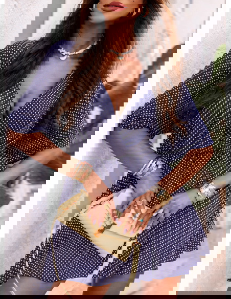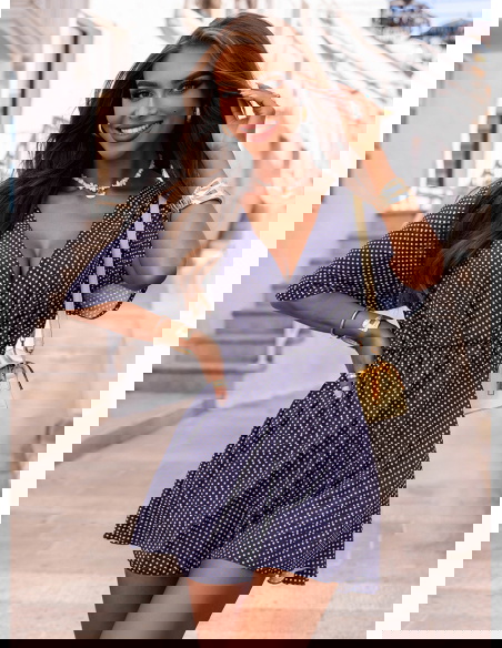 Wzorzysty kombinezon jak sukienka z przekładanym dekoltem Benedetta - O28 to ukłon w stronę ponadczasowej elegancji z lekkim, dziewczęcym twistem. Choć wygląda jak klasyczna sukienka mini, skrywa w sobie wygodne szorty, dzięki czemu łączy styl z pełną swobodą ruchu. Subtelny granatowy odcień w drobne groszki przywołuje na myśl klimaty dawnych włoskich filmów i romantycznych spacerów po wąskich uliczkach. Kopertowy dekolt pięknie eksponuje szyję i biust, a elastyczna talia akcentuje kobiecą sylwetkę. Delikatnie opadające rękawy dodają całości lekkości i nonszalancji. To model, w którym poczujesz się zarówno kobieco, jak i komfortowo. Dzięki lekko rozkloszowanemu dołowi sylwetka nabiera lekkości, a każdy ruch wygląda naturalnie i płynnie. Kombinezon ten to idealny kompromis między sukienką a szortami, który zaskakuje swoją uniwersalnością. To propozycja dla kobiet ceniących swobodę, ale chcących wyglądać stylowo bez zbędnego wysiłku. Wystarczy jeden rzut oka, by zakochać się w tym fasonie.