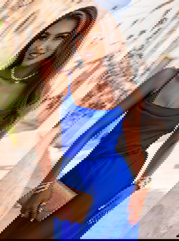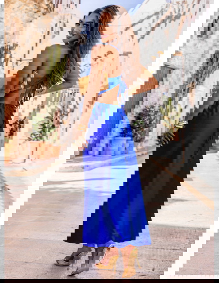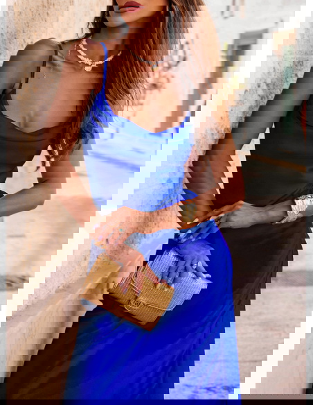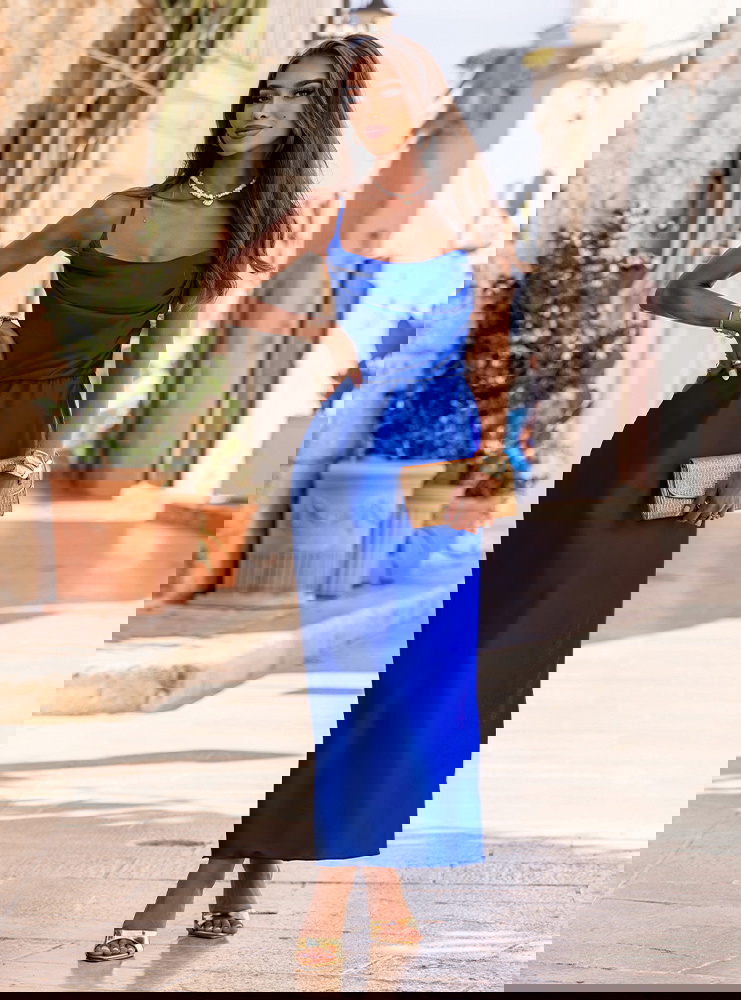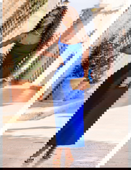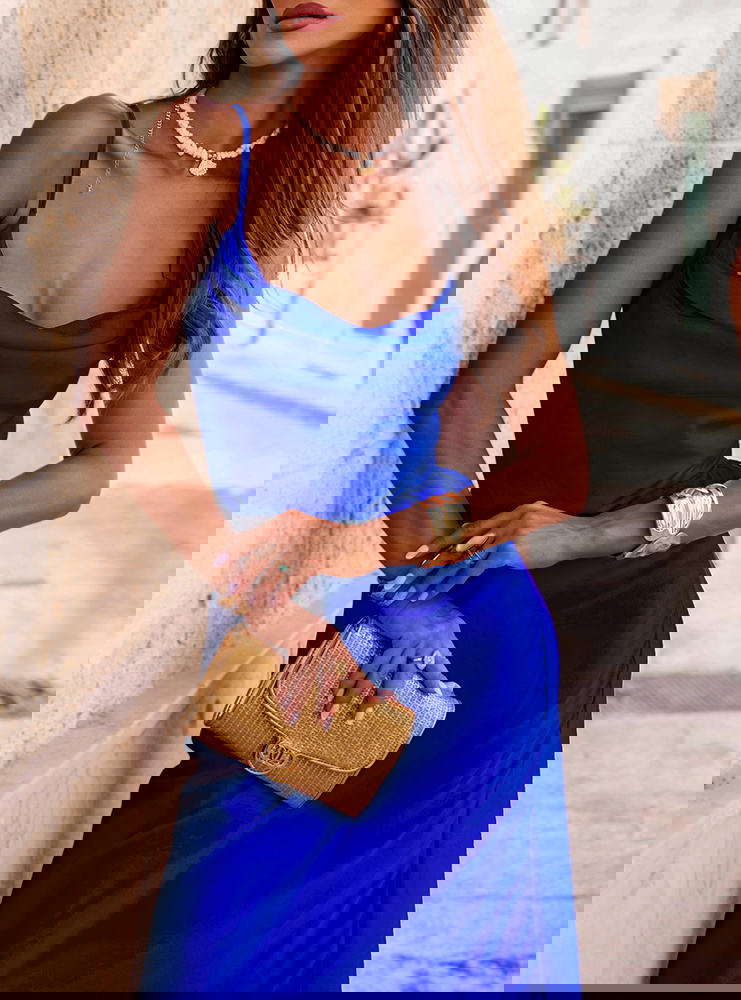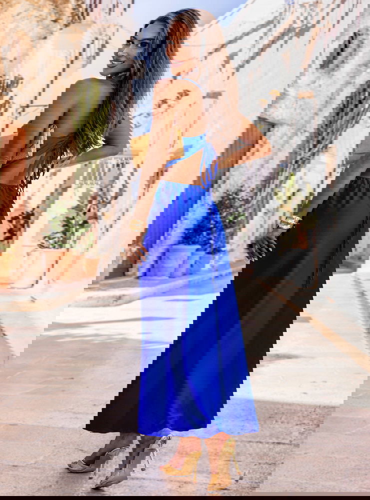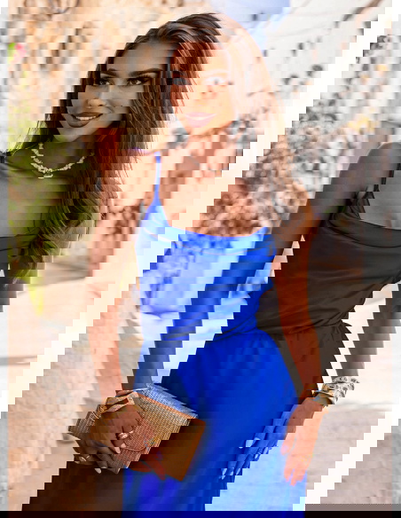 Chabrowa satynowa sukienka wiązana bez pleców Lorretta to prawdziwa perła w letniej kolekcji – model, który zachwyca kolorem, krojem i subtelną zmysłowością. Intensywny odcień chabru natychmiast przyciąga wzrok i doskonale podkreśla letnią opaleniznę. Gładka satyna z połyskiem miękko opływa ciało, dodając sylwetce lekkości i elegancji. Cienkie ramiączka i dekolt typu woda subtelnie eksponują ramiona oraz obojczyki, nadając całości delikatności. Tył sukienki całkowicie odsłania plecy, tworząc efekt „wow” dzięki stylowemu wiązaniu, które można dopasować indywidualnie. Długość midi podkreśla kobiecą sylwetkę, jednocześnie zachowując klasę i szyk. Minimalistyczna forma tej sukienki pozwala na pełną swobodę w stylizacji – świetnie komponuje się z dodatkami w złocie lub perłach. To model idealny dla kobiet ceniących subtelną elegancję z odrobiną śródziemnomorskiego temperamentu. Zwiewna, lekka, niezwykle komfortowa – stworzy doskonałą stylizację zarówno na dzień, jak i na wieczór.