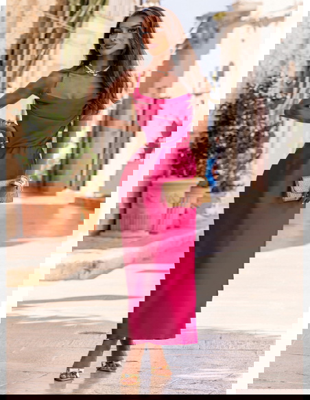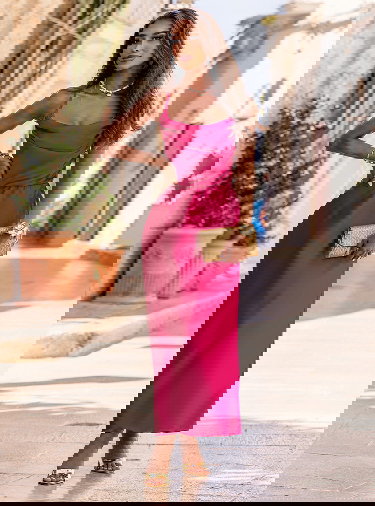 Satynowa sukienka wiązana bez pleców Lorretta - fuksja to propozycja dla kobiet, które lubią podkreślać swoją energię i kobiecość. Intensywny odcień fuksji dodaje charakteru i świetnie współgra ze skórą muśniętą słońcem. Sukienka pięknie układa się na ciele, płynnie podkreślając sylwetkę. Delikatny dekolt typu woda eksponuje szyję i ramiona w wyjątkowo subtelny sposób. Cienkie ramiączka i efektowne wiązanie z tyłu tworzą pełen wdzięku, zmysłowy tył sukienki. Długość midi nadaje całości klasy, a zarazem pozwala czuć się swobodnie i lekko. Model wyróżnia się prostą formą, która robi duże wrażenie właśnie dzięki swojej eleganckiej oszczędności. Wystarczy jeden ruch, by materiał zagrał światłem i dodał Ci blasku. To sukienka, która nie potrzebuje wiele – wystarczy ją założyć. W kolekcji La Dolce Vita to odważny, a zarazem stylowy wybór na lato.