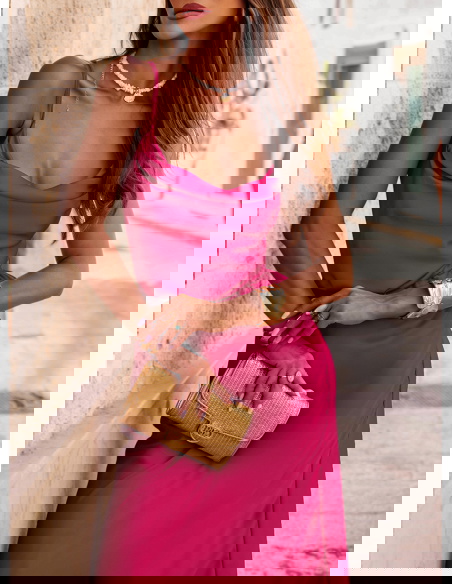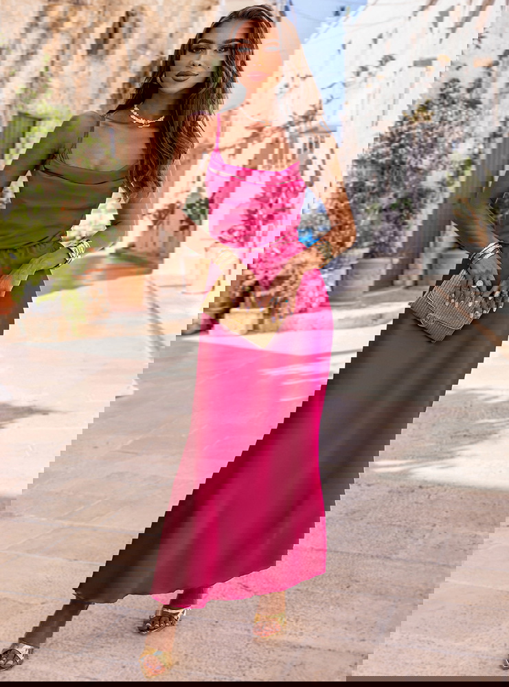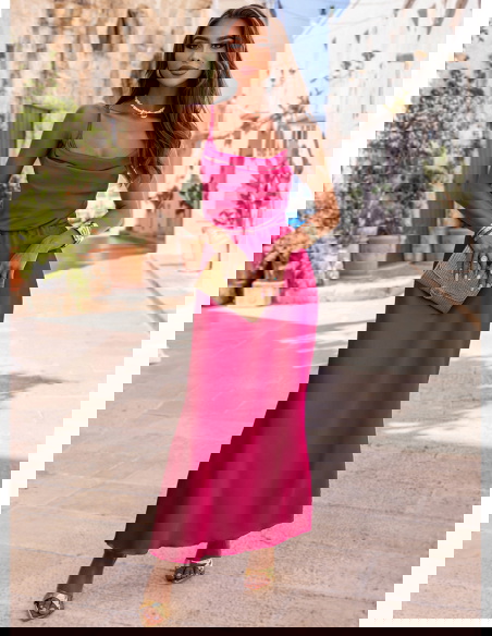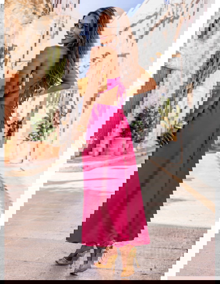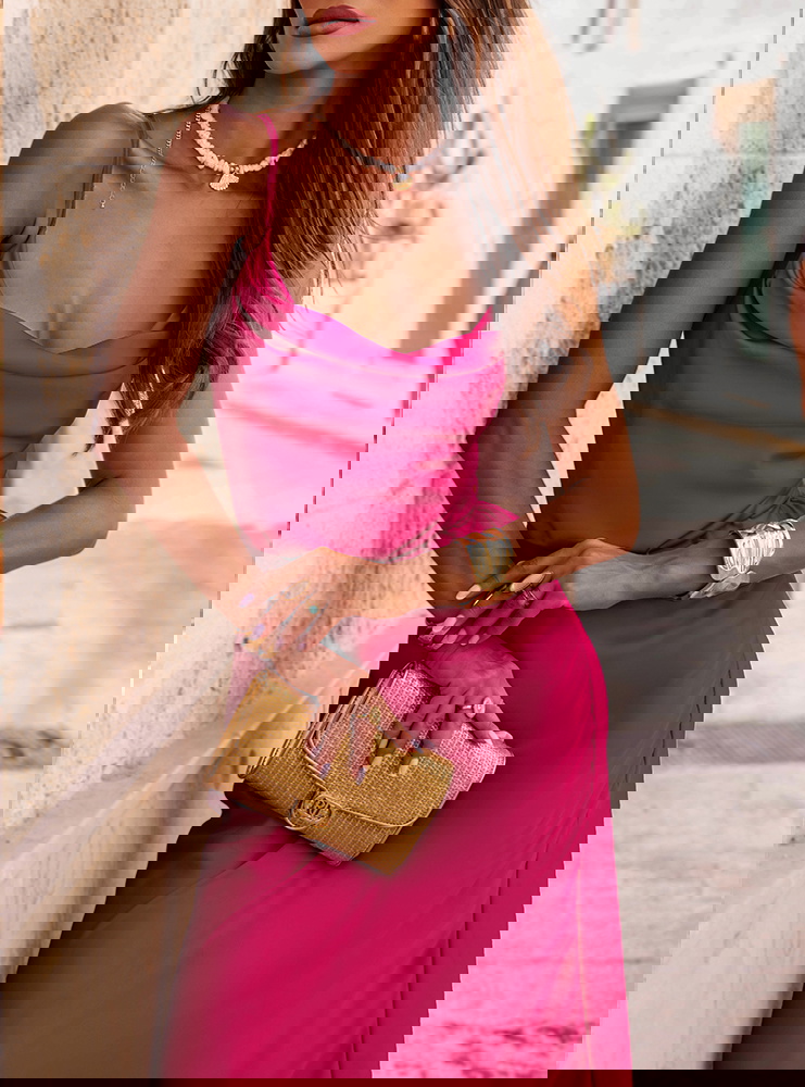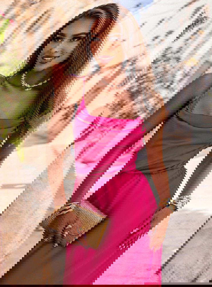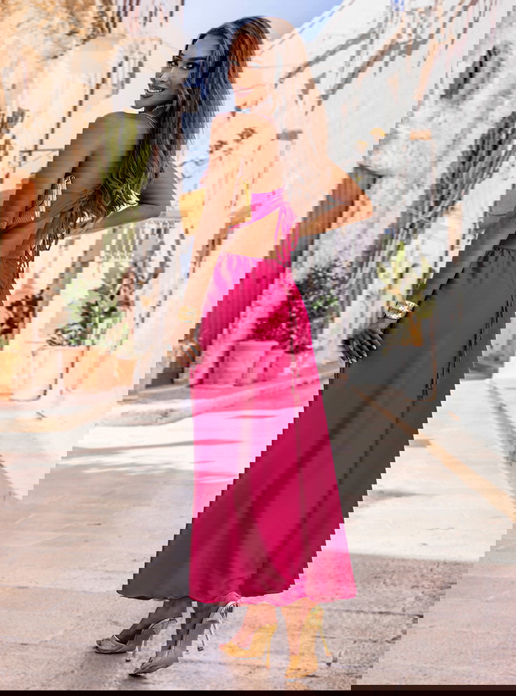 Satynowa sukienka wiązana bez pleców Lorretta - fuksja świetnie sprawdzi się na letnie przyjęcia, wesela czy kolacje w ciepły, wakacyjny wieczór. Możesz ją założyć na randkę, event w ogrodzie albo wieczorne wyjście z przyjaciółkami. Jej kolor i krój doskonale odnajdują się w stylizacjach wieczorowych, ale też tych bardziej casualowych – z klapkami lub espadrylami. W połączeniu ze złotą biżuterią wygląda zjawiskowo. To model, który zawsze przyciąga uwagę.