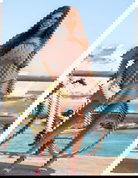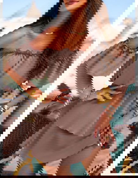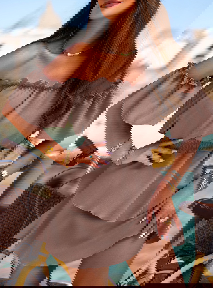 Kombinezon jak sukienka z odkrytymi ramionami Lodoletta - mocha mousse to esencja kobiecego uroku w wakacyjnym wydaniu. To idealny wybór dla kobiet, które lubią wyglądać stylowo bez rezygnowania z komfortu. Lekkość formy łączy się tutaj z romantycznym fasonem i subtelnym kolorem inspirowanym włoską kawą. Odcień mocha mousse to propozycja dla miłośniczek neutralnych, ale niebanalnych barw. Kombinezon wygląda jak sukienka – falbany i rozkloszowany dół dodają mu dziewczęcej lekkości. Elastyczna talia pięknie zaznacza sylwetkę i sprawia, że model dopasowuje się do ciała. Odsłonięte ramiona nadają całości letniego wdzięku i delikatnego zmysłowego charakteru. To idealna propozycja na długie dni w słońcu – stylowa, ale niewymuszona. Delikatne falowania materiału poruszają się przy każdym kroku, dodając subtelnej dynamiki. Lodoletta to model, który szybko stanie się Twoim ulubionym wyborem na lato.