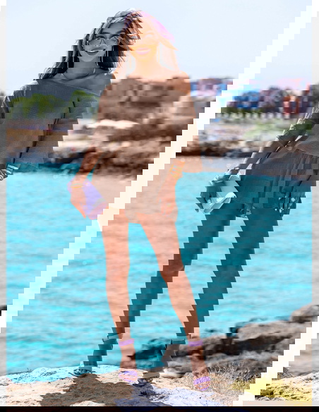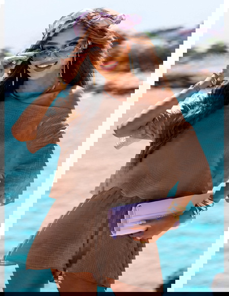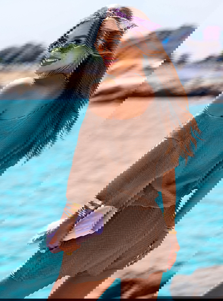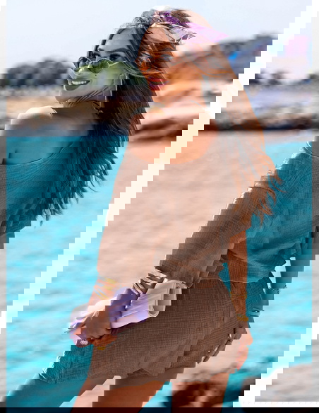 Muślinowy komplet szorty i top Inesta - mocha mousse to must-have na letnie miesiące. Łączy komfort z elegancją w wyjątkowo naturalny sposób. Jego stonowany odcień pasuje do wielu stylizacji i akcesoriów. To opcja, która dodaje uroku bez nadmiernego wysiłku. Luźny krój daje poczucie swobody, a jednocześnie prezentuje się bardzo stylowo. To jeden z tych zestawów, które nosi się z przyjemnością – bo wyglądasz świetnie i czujesz się swobodnie. La Dolce Vita w pełnym wydaniu – kawa z widokiem, słońce na skórze i styl, który mówi sam za siebie.