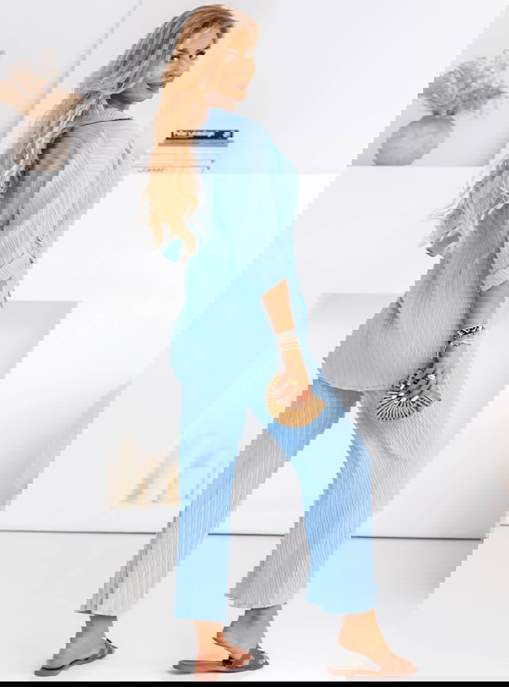 Błękitny komplet koszula zapinana na guziki i spodnie Preivaine to kwintesencja elegancji połączonej z codzienną wygodą. Koszula zapinana na guziki i spodnie o szerokich nogawkach tworzą spójną całość, która zachwyca lekkością fasonu. Delikatny, neutralny odcień pięknie podkreśla opaleniznę i świetnie komponuje się z wakacyjnymi dodatkami. Sprawdzi się podczas letnich spacerów i spotkań z przyjaciółmi. To doskonały wybór na weekendowe wyjazdy, gdzie liczy się komfort i styl. Z powodzeniem zabierzesz go na wakacyjne kolacje na tarasie lub do kawiarni przy plaży. Świetnie wpisuje się w miejskie zestawy z lekkimi sandałami lub espadrylami. Dzięki uniwersalnemu fasonowi możesz łatwo przekształcić go w bardziej szykowny look, dobierając ulubione dodatki.